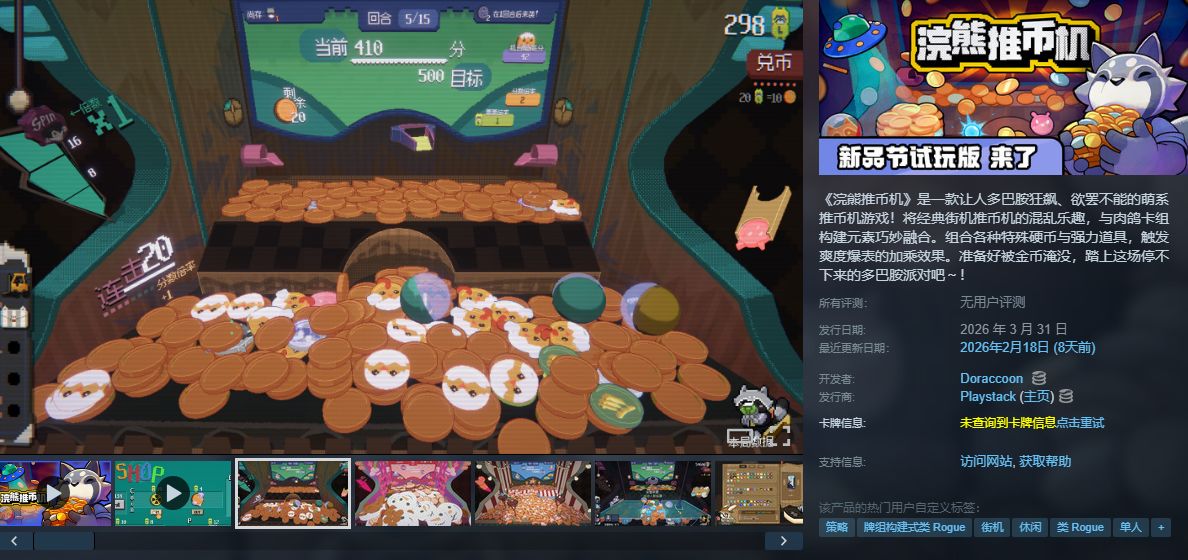 《浣熊推幣機》是一款融合街機推幣玩法與肉鴿策略的像素風遊戲,玩家通過投擲特殊代幣觸發連鎖反應,搭配道具和芯片構建強力流派,目標達成關卡分數要求。遊戲含多角色和超100種道具,支持倍率疊加、連擊獎勵等爽快機制。