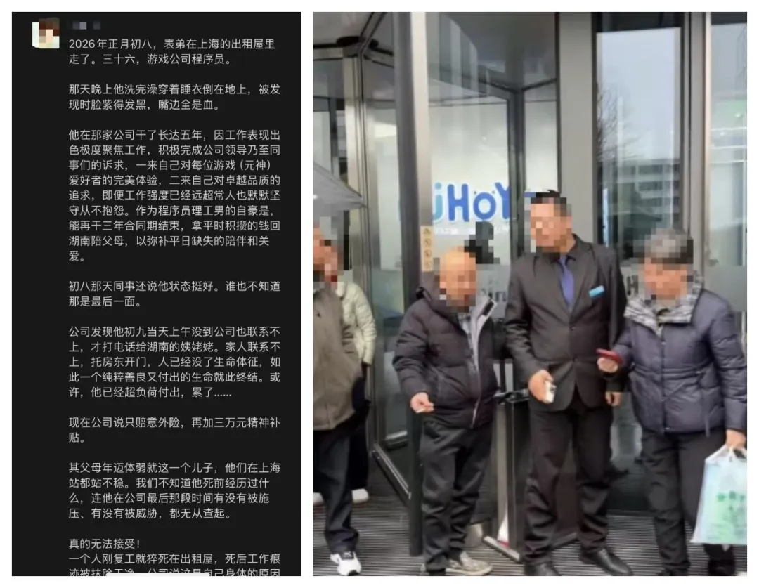 1. 近日,網傳一位米哈遊《原神》項目組成員在初八復工後在其住所不幸離世,家屬發文稱逝者已在米哈遊工作五年。米哈遊迅速針對此事件在內部發布了說明,表示對逝者深表痛心與惋惜,還提到一些安置後事的舉措——「公司已成立專項小組,在充分尊重家屬意願的前提下,全力協助家屬處理善後事宜,提供一切必要的支持與陪伴。」、「公司有完整的員工關懷政策來爲意外情況兜底,包括商業保險、後事安置金、專項慰問補助等」。來源:遊戲新知