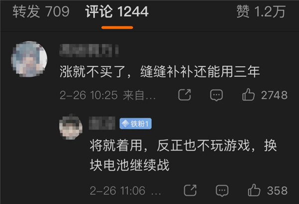 手机涨价话题下,高赞评论大多是“涨就不买了,缝缝补补还能用三年”,“换块电池继续用”。