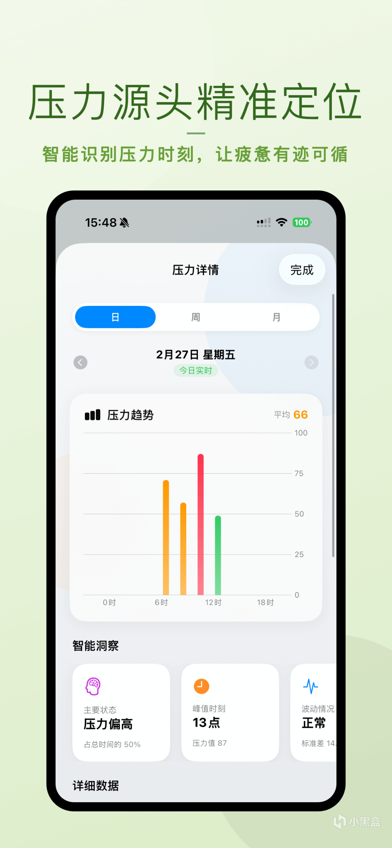 不仅仅是数字,我们让压力“可视化”。首页实时展示压力状态,新增压力源头精准定位,帮你分析是工作、睡眠还是其他因素导致了压力波动。试试搜索“压力自测”,让腕能帮你找到答案。