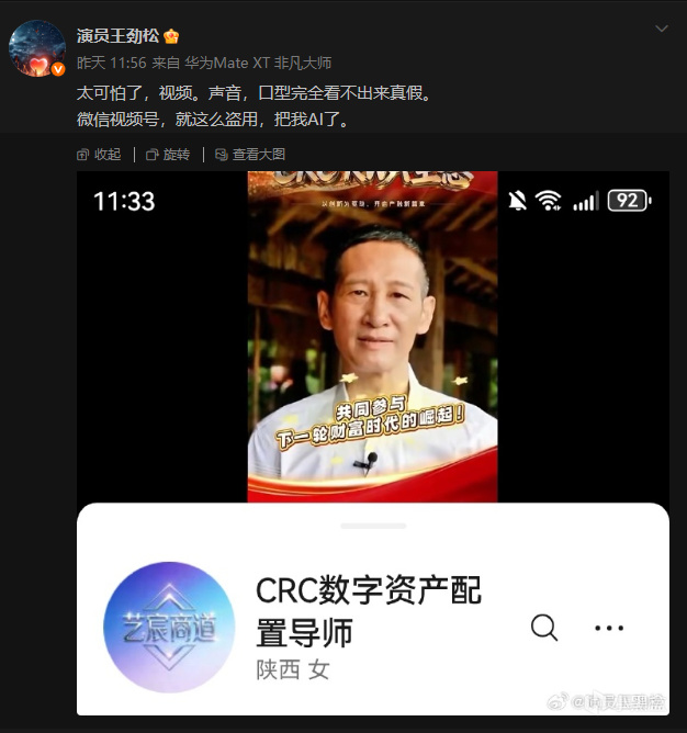 近日,演員王勁松本人在微博表示,近期自己被AI僞造的視頻,據悉,原視頻是其2020年6月拍攝期間發佈的一條宣傳拒絕毒品的視頻,被自媒體博主使用AI製作成了廣告視頻。