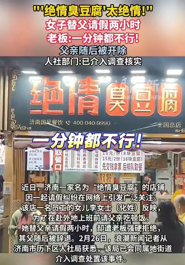 2026年春节刚过,山东济南宽厚里街头一起用工纠纷引发全网热议:女子李女士(化姓)为在赴外地上班前陪父亲吃一顿离别饭,替父亲向所在店铺请假2小时,不仅遭到老板强硬拒绝,其父亲还被当场开除,且未获得任何经济补偿。2月27日,李女士正式公开发声,还原事件始末,明确表示将通过法律途径维权,只求为勤恳一生的父亲讨回公道,也希望能让更多底层劳动者的合法权益得到重视。