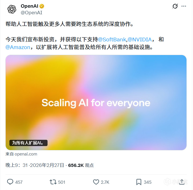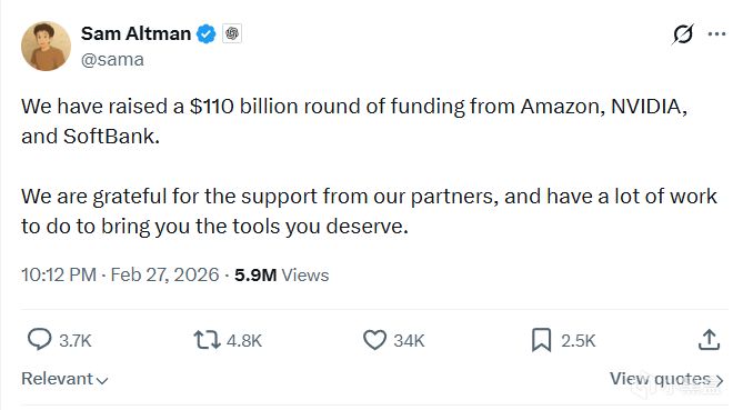 我们从亚马逊、英伟达和软银那里筹集了1100亿美元的一轮融资。 我们感谢合作伙伴的支持,并且还有很多工作要做,以带给您应得的工具。