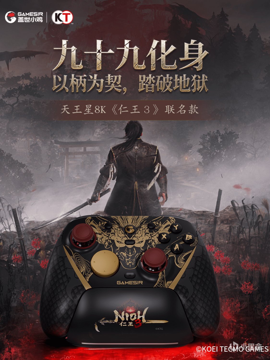 盖世小鸡天王星8K x 仁王3联名手柄——面壳灵感源自“九十九化身”,整体造型更具力量感;灯条边缘加入金色龙纹细节,点亮时仿佛妖力流动。握把采用黑色铠甲质感设计,呼应守护灵化为武具的设定;专属智能充电底座融入草薙剑元素,充电时如武器归鞘,收藏与实用兼具。(图5)https://detail.tmall.com/item.htm?id=1009246301101」