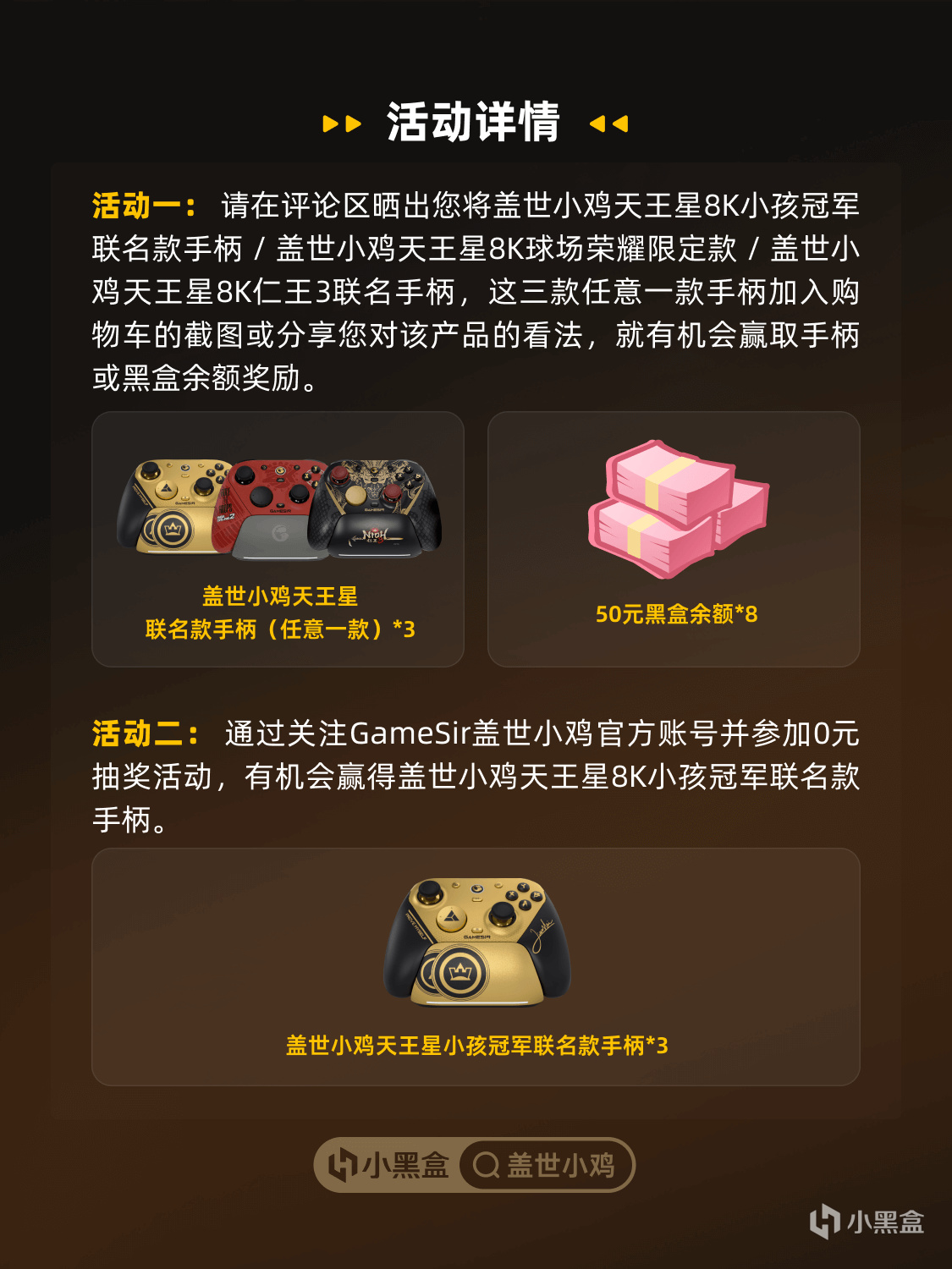 在评论区晒出您将盖世小鸡天王星8K小孩冠军联名款手柄 / 盖世小鸡天王星8K球场荣耀限定款 / 送盖世小鸡天王星8K仁王3联名手柄,这三款任意一款手柄加入购物车的截图或分享您对该产品的看法,就有机会赢取手柄或黑盒余额奖励。