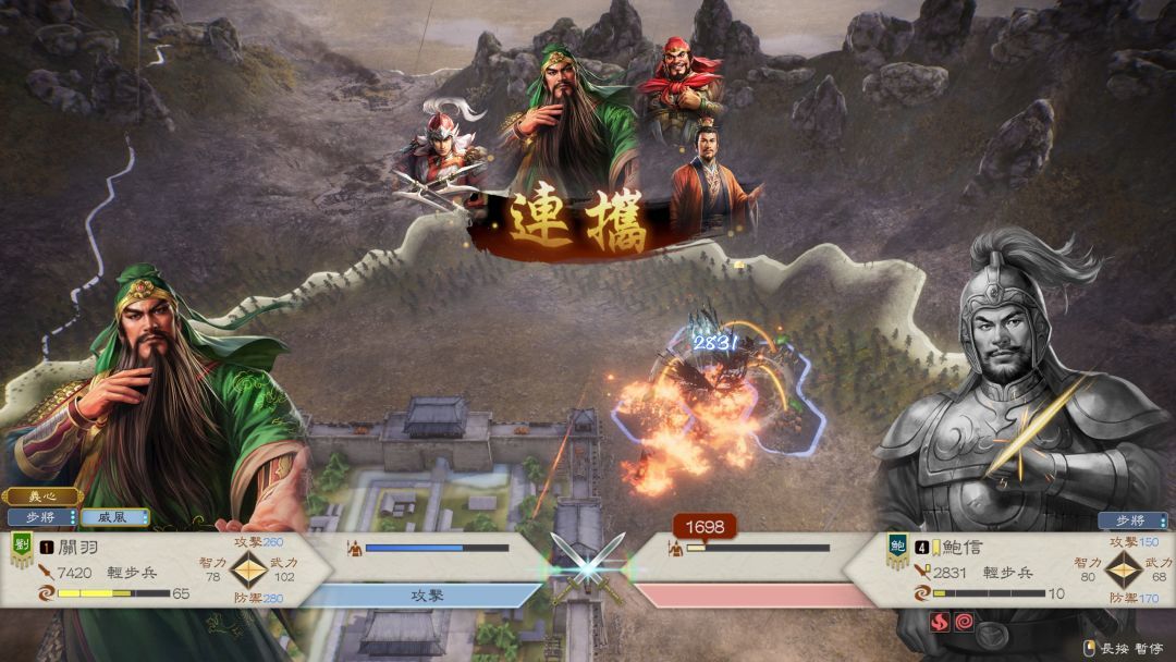 《三国志8 REMAKE 威力加强版》的战斗系统依然是《三国志8 REMAKE》的回合制战棋模式,部队的战斗里没有系列其他作品的训练值,更加注重的是领兵将领的属性和特性,战斗力也并不是一味的注重个人能力和战法,依靠好友之间的连携攻击就能达到惊人的输出,通俗一点的说法就是:一堆垃圾就能“三英战吕布”,甚至还能把吕布围殴死!战斗节奏也更快了,策略性减少不少,反正就是几个关系好的一起走,神挡杀神就对了!这让本身非常需要玩家策略能力才能玩得动的战棋系统的乐趣少缺不少,毕竟AI敌人可不懂得把关系好的一堆人派一起出场!