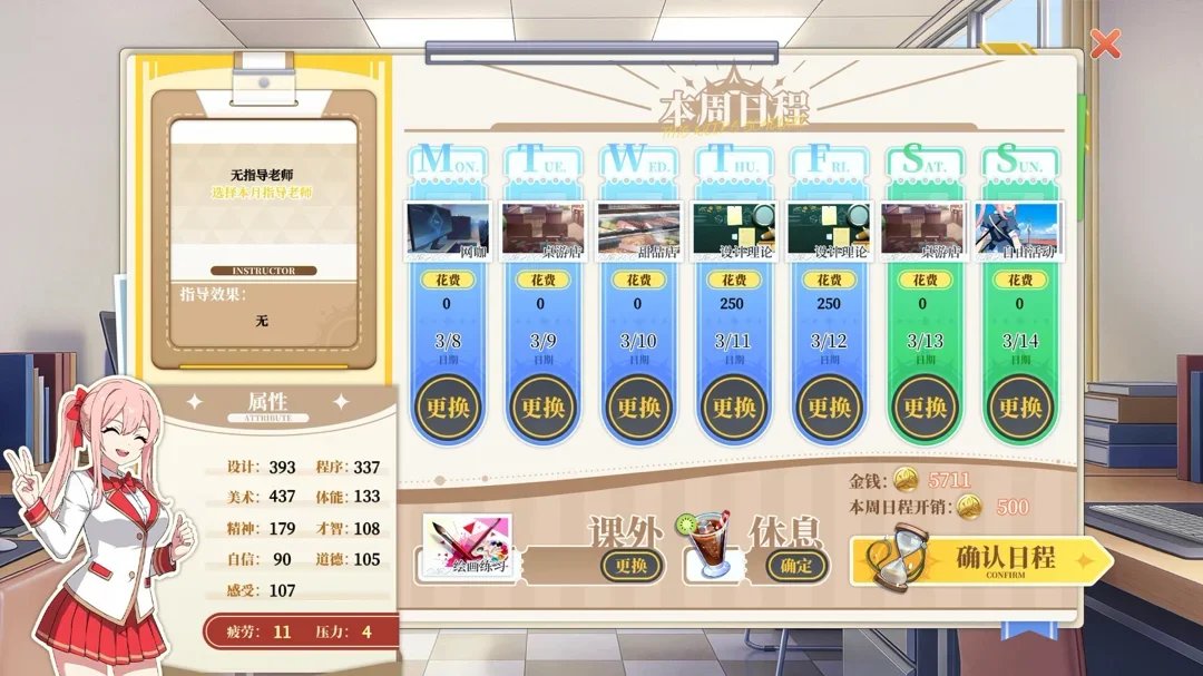 校園+遊戲開發主題的多結局養成遊戲。你是遊戲班唯一的老師,帶着一個學生在三年裏安排日程:上課、打工、做外包攢經驗,核心是自己設計開發遊戲,上線衝評價拿大獎,還要跟其他6所遊戲高中競爭。