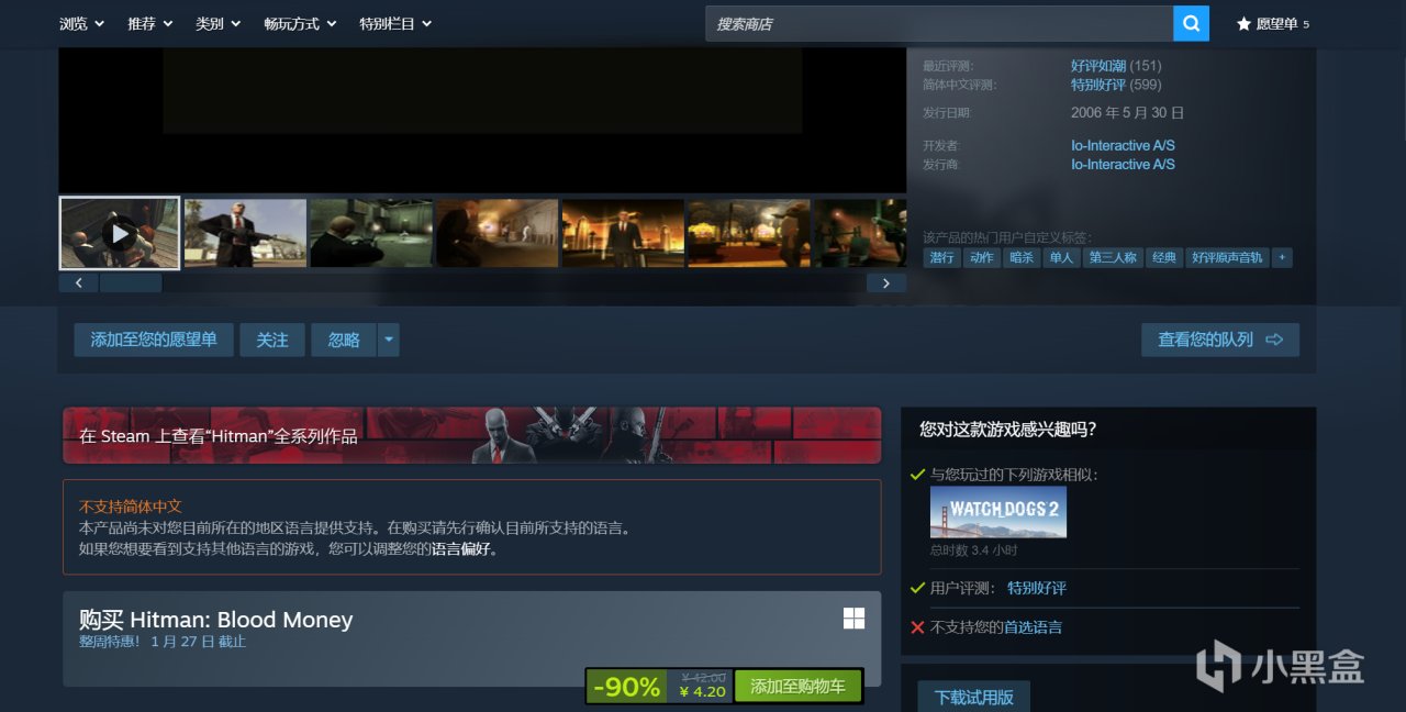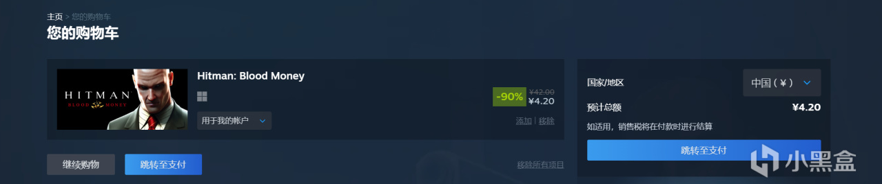 2.在Steam中找一款特别便宜或者你本就想买的游戏,添加到购物车(比如我加了杀手4)