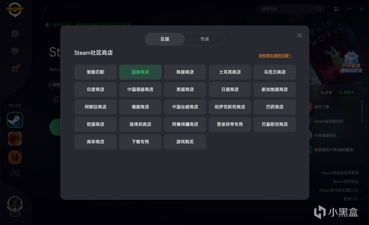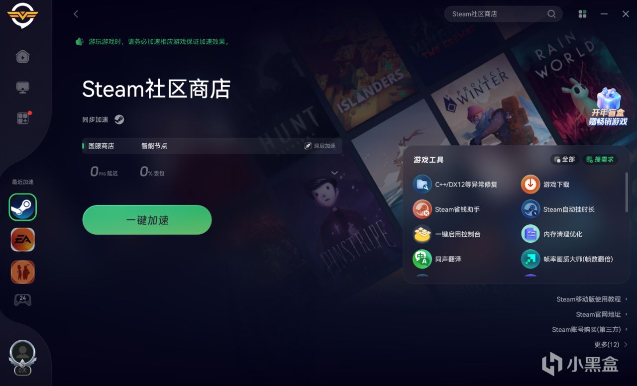 1.启动国服加速Steam商店(免费的!)