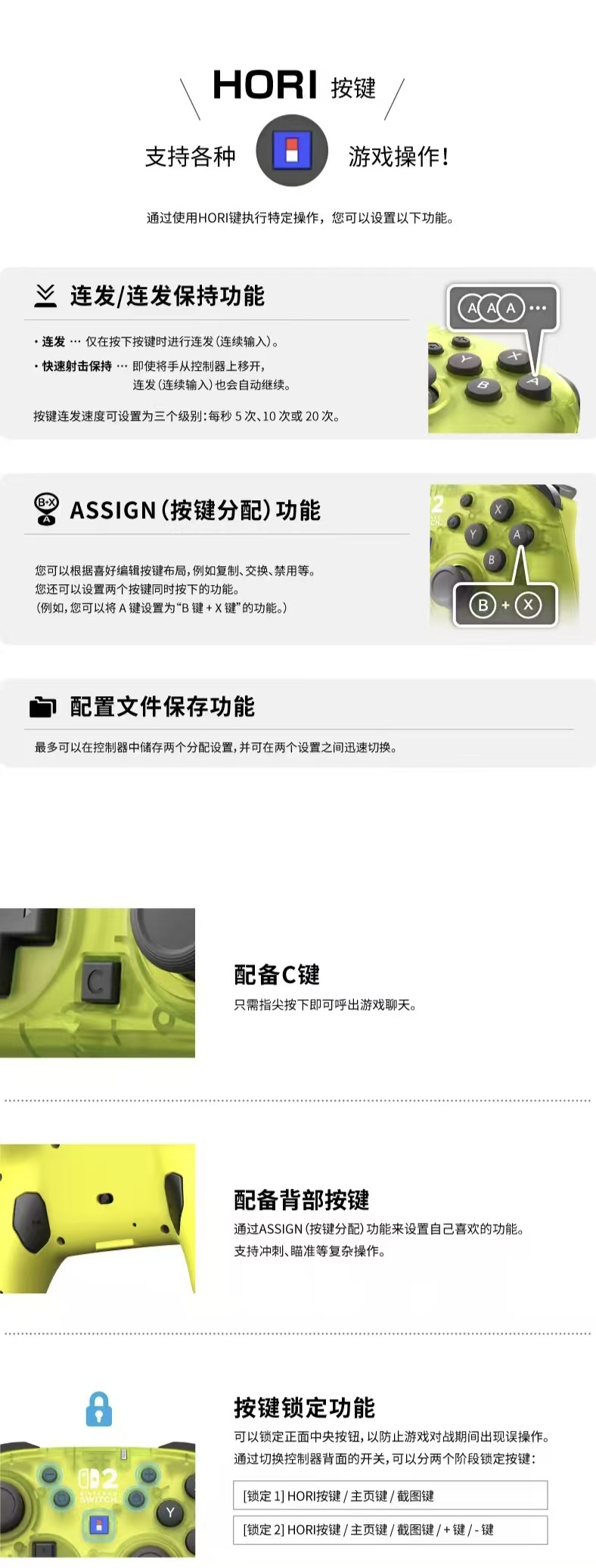 除此之外,这款手柄还配备了连发功能,玩家们可以通过手柄正面的HORI键执行特定的操作,诸如连发、快速射击保持等功能都可以轻松实现,从而实现快速种植/收割(《星露谷物语》)、连续出拳(《ARMS》)、快速钓鱼收线(《集合啦!动物森友会》)等诸多游戏操作,对于没有作弊器的switch而言,这项功能让重复操作变得轻松省力,尤其适合手部疲劳或操作不便时使用。