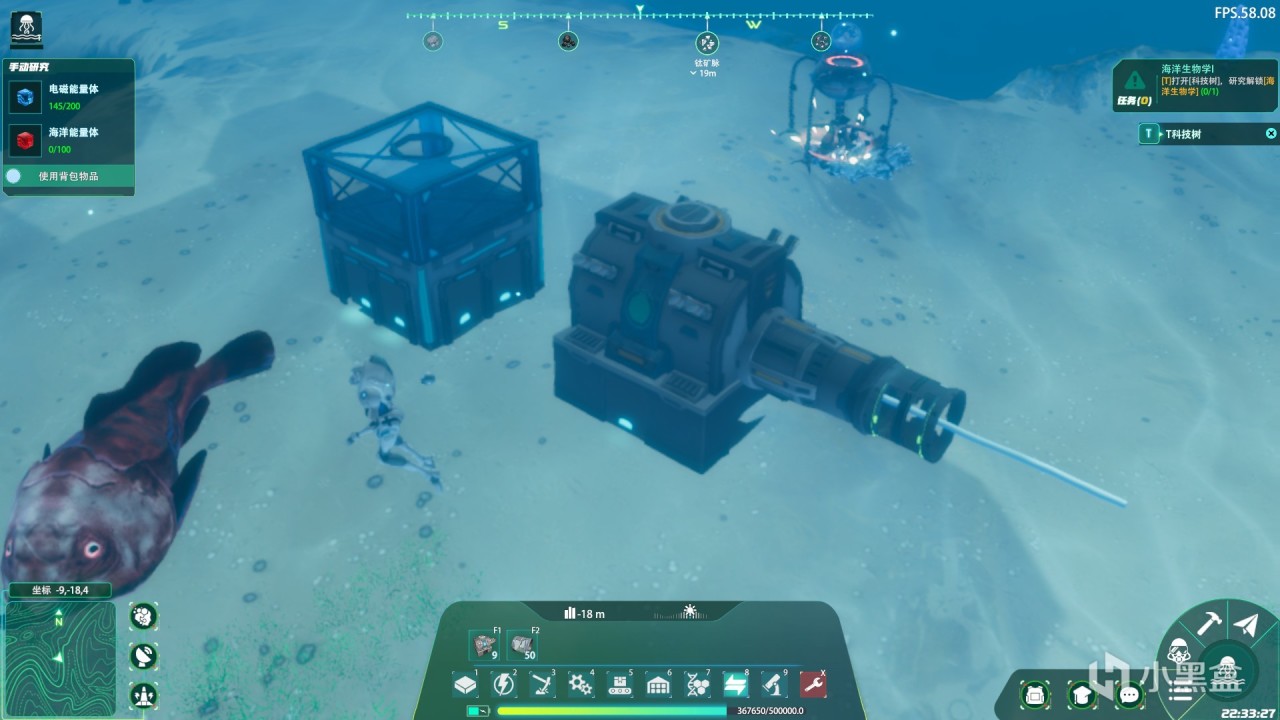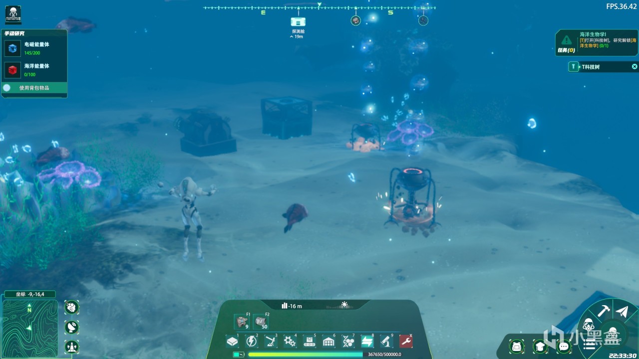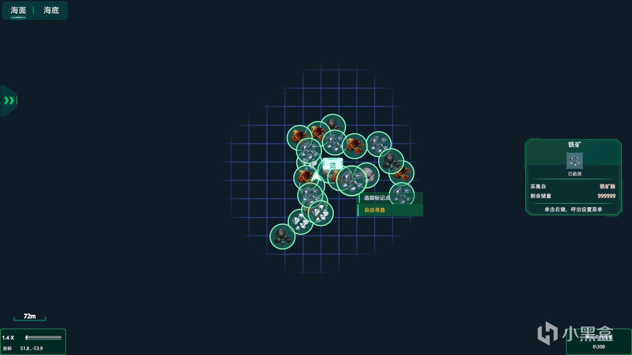 那怎么快速高效的寻找矿石资源呢?宇航服还给我们配置了强大的声呐扫描装置,在海里可以对周围的矿物进行扫描直接标记在地图和指南针上,我们可以快速定位。面对一些植物和矿物我们可以进行收集研究,只需要一定数量的同类物质就可以研究,同样可以解锁一些副产品和一个新的工具设备。