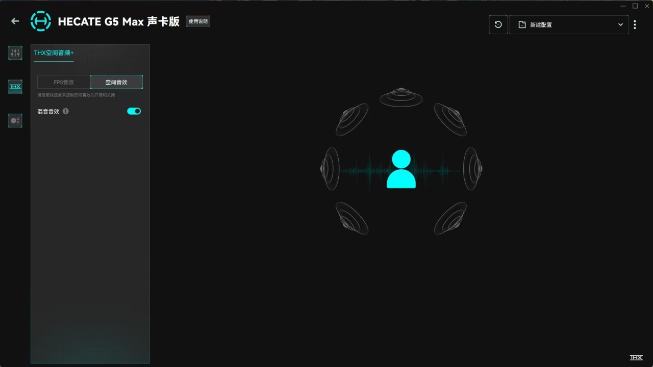 拨动控制模块上的拨杆,还可以在无驱动状态下直接开启THX音效。这个模式会优化头顶上方的音源定位,对于声音系统做得比较出色的游戏来说,是个极大的加分项,临场感也会明显提升。