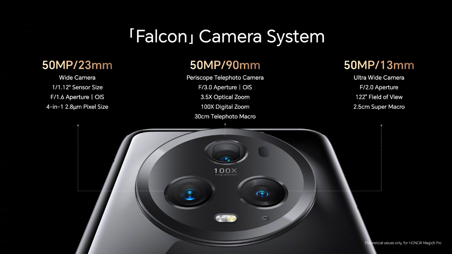 影像方面,荣耀 Magic5 Pro 采用 5000 万像素三主摄影像系统:5000 万像素广角主摄,拥有 1/1.12 英寸超大底传感器,搭配 f / 1.6 超大光圈,带来更大进光量和更好画质;5000 万像素潜望式长焦主摄,最高支持 100 倍数字变焦;5000 万像素超广角主摄,支持 122° 超大视角,2.5cm 超级微距。与此同时,全新升级长焦融合计算光学技术,实现了 3.5x-100x 长焦焦段的画质提升。自拍方面,荣耀 Magic5 Pro 前置 1200 万像素超广角镜头(f / 2.4 光圈 )+ 3D 深感摄像头,支持 3D 人脸识别。