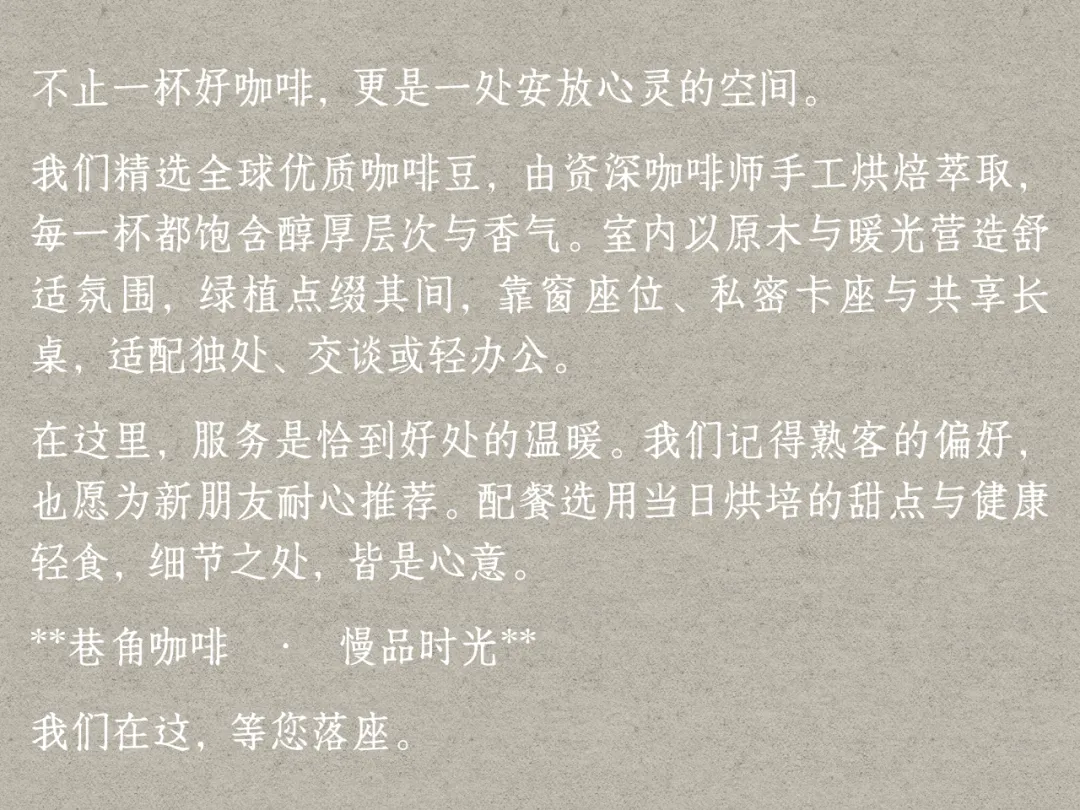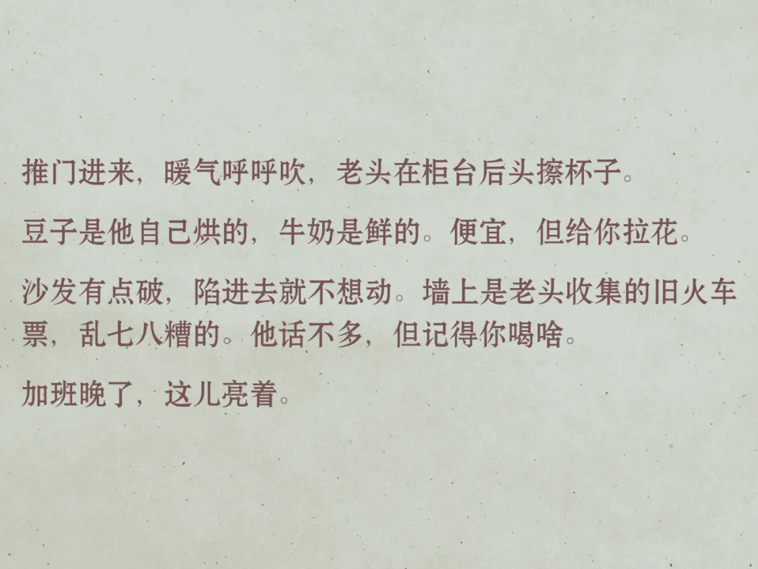 不需要吹嘘它的“格调”,要写出那种“下班路上,推开门,暖气和咖啡香扑面而来”的真实感。