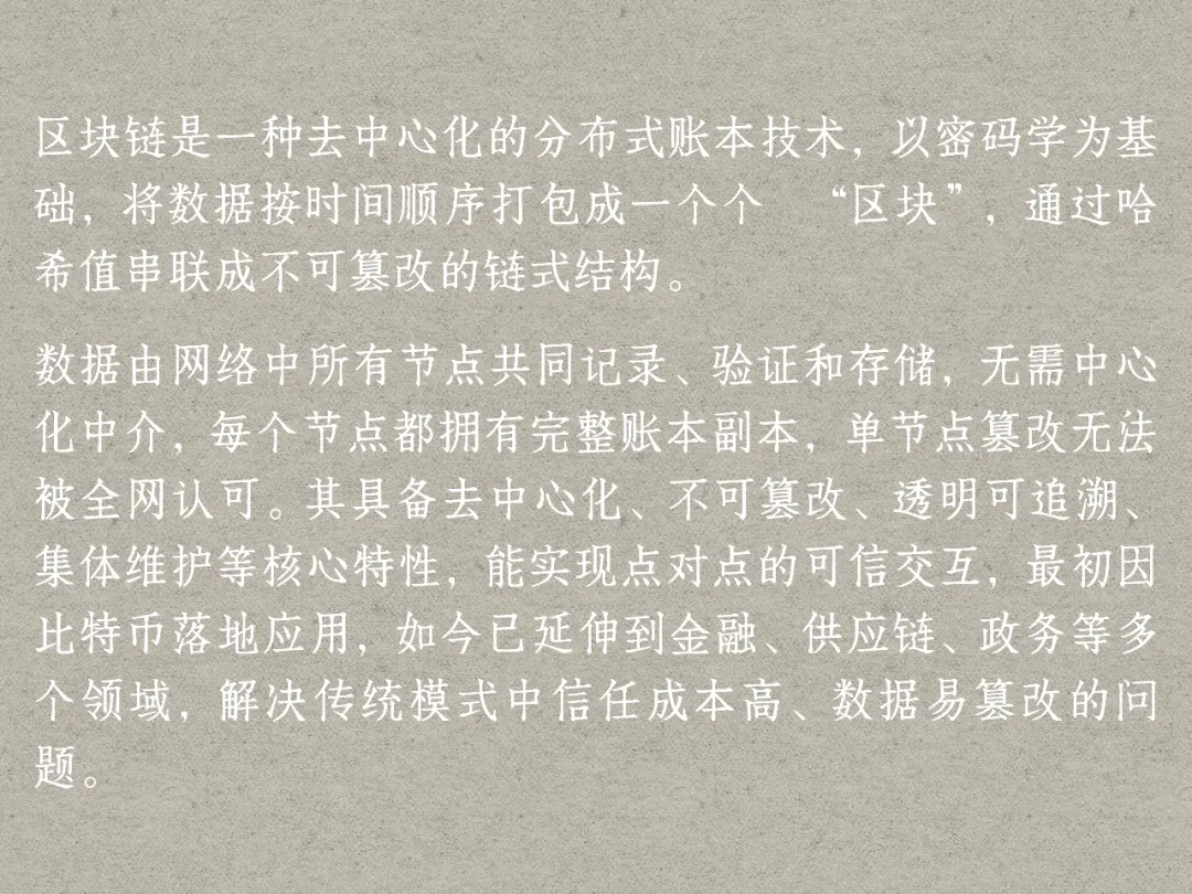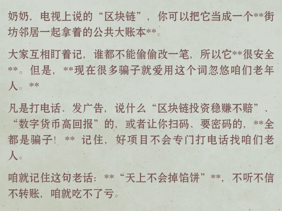 假设你在帮奶奶理解区块链。她最近总在电视上听到这个词,有点担心自己落后了。用她熟悉的存折本作比喻,解释清楚这技术为什么安全,但也要提醒她现在哪些相关广告可能是骗老人的。最后用一句她常说的口头禅结尾。