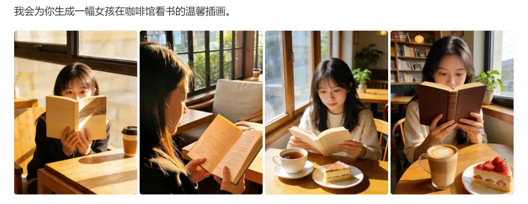 画一个在咖啡馆看书的女孩,阳光明媚,温馨风格。