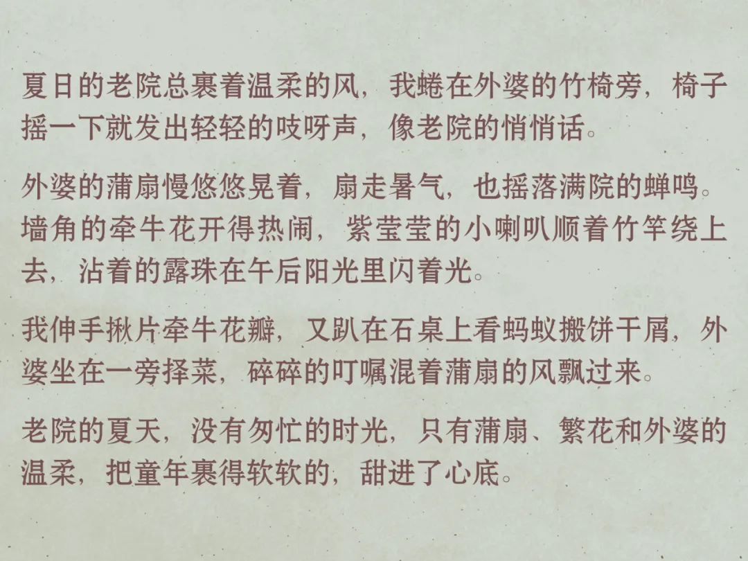 写一篇童年短文,风格温馨治愈,以夏日老院为场景,细节包含外婆的蒲扇、墙角的牵牛花、竹椅的吱呀声,第一人称视角,语言细腻有画面感,200字左右。