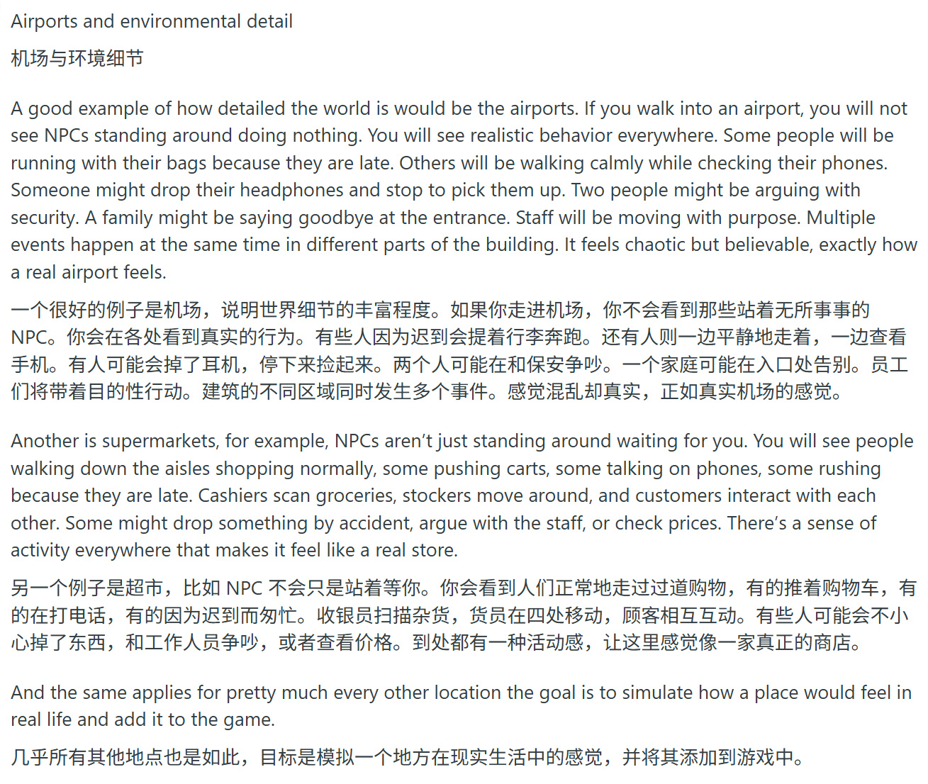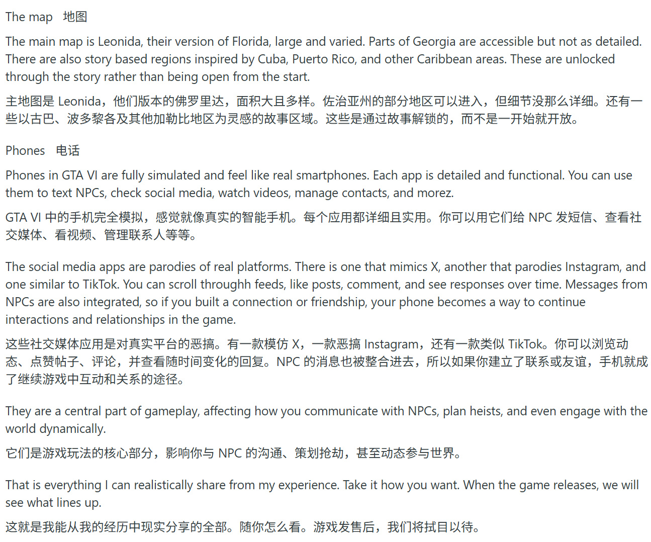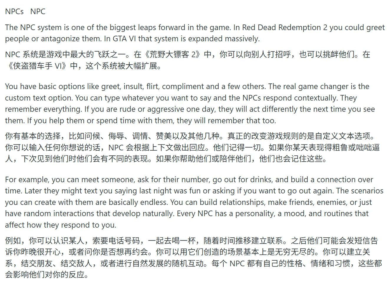 該用戶聲稱近距離接觸過遊戲,並形容其真實感、物理質感與操作手感堪比《最後生還者 第二部》,但置於開放世界中。無論玩家是否在場,遊戲世界都充滿生機。NPC互動系統相比《荒野大鏢客2》大幅升級,在《GTA6》中玩家可使用遠超基礎對話的選項。據稱存在自定義文本輸入功能,玩家可鍵入內容,NPC將根據語境回應。NPC還具備獨特個性與記憶系統。