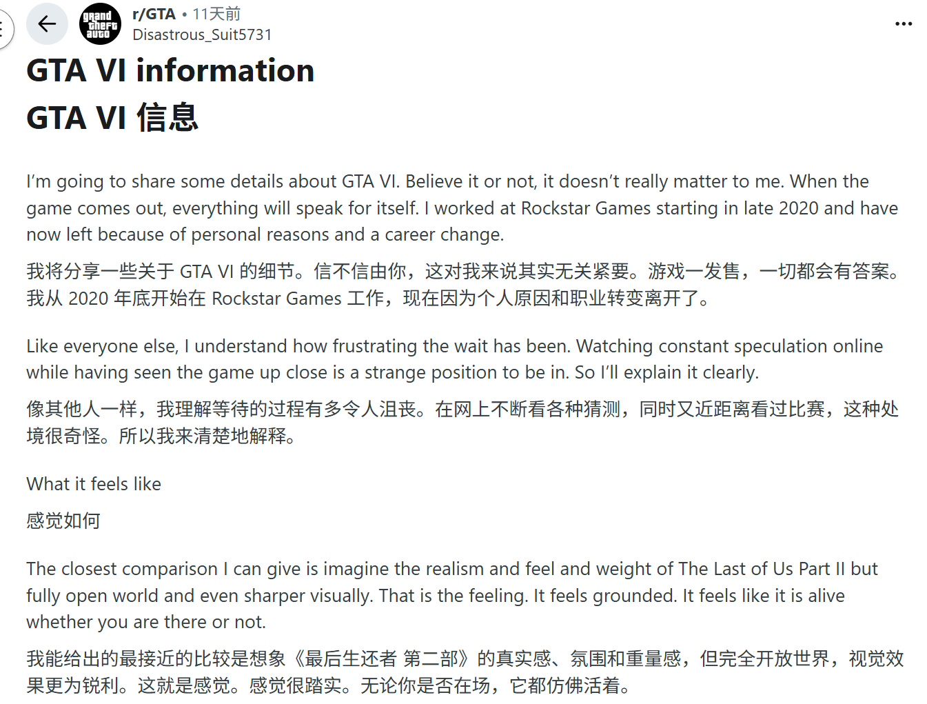 在進入正文前需知背景。用戶"Disastrous_Suit5731"在r/GTA子論壇發佈的這篇帖文發佈於11天前。這是該用戶五年Reddit生涯中的唯一發帖。其自稱2020年末入職Rockstar,近期因"個人原因與職業變動"離職。不過,絕大多數評論者對此表示質疑。以下是帖文具體內容。