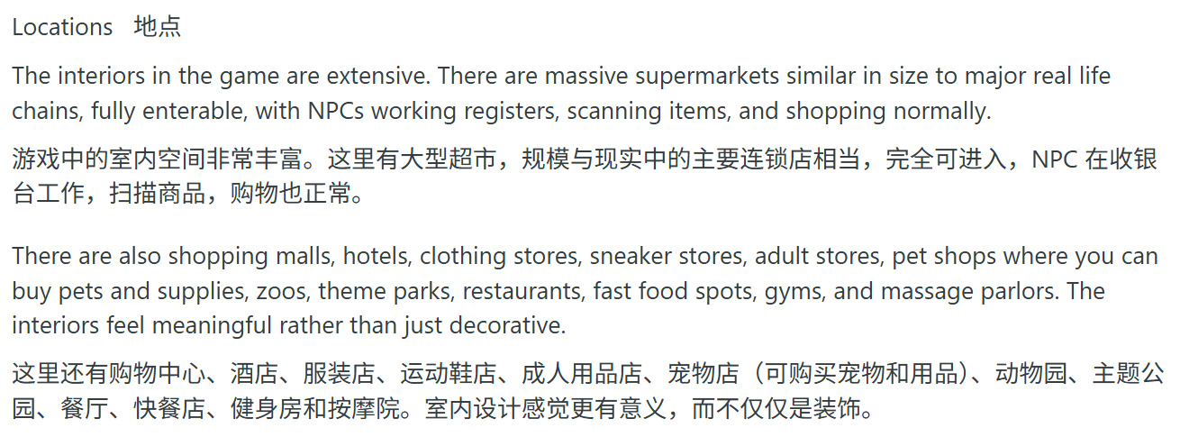 《GTA6》中機場等建築內部將更具可探索性與真實感。NPC會呈現獨特行爲模式,如同現實機場所見。超市規模宏大且設有收銀NPC。其他可進入建築包括商場、酒店、服裝店、成人用品店、運動鞋店、寵物店等。