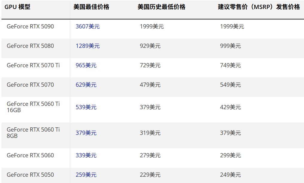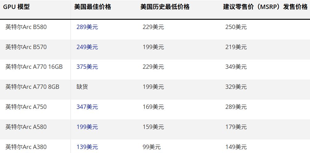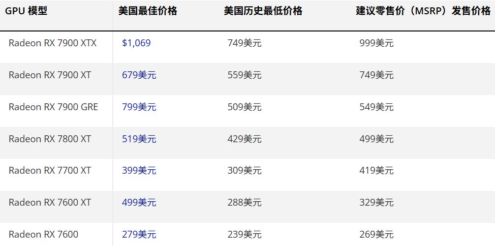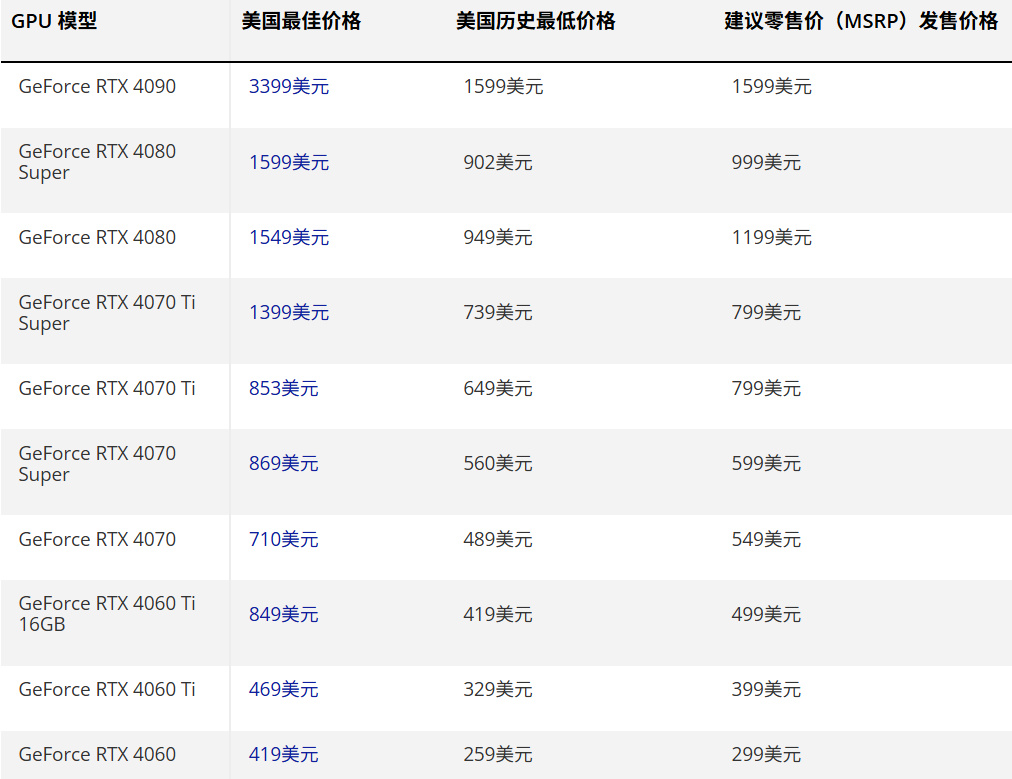 下图为AI价格危机期间美国的英伟达、AMD和英特尔所有显卡的最低价格最佳优惠