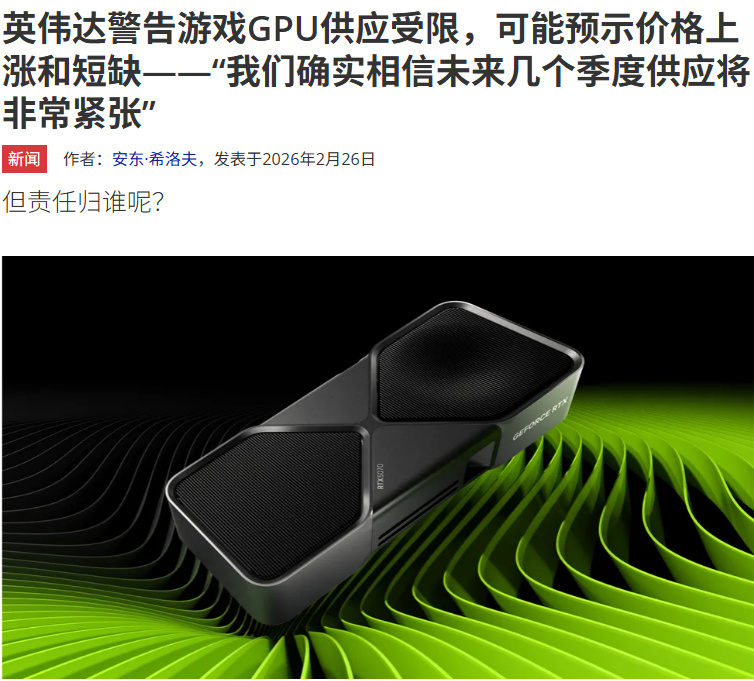 而游戏业务务虽增长30%,但占比已远不如从前,萎缩至总业务的7.4%,本季度营收37亿美元CEO黄仁勋进一步警告:2026年上半年游戏显卡供应将极度紧张。他在电话会议上表示: