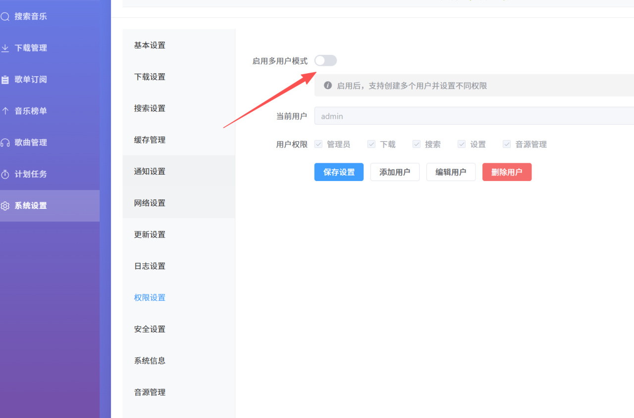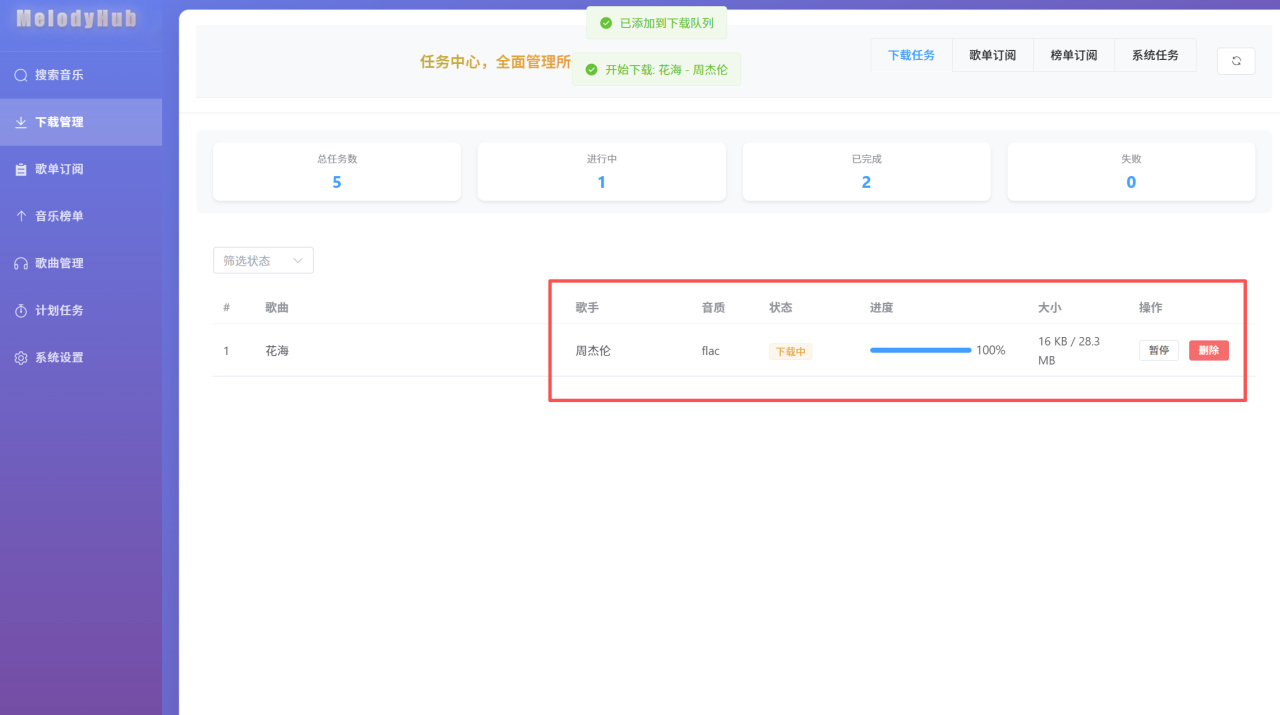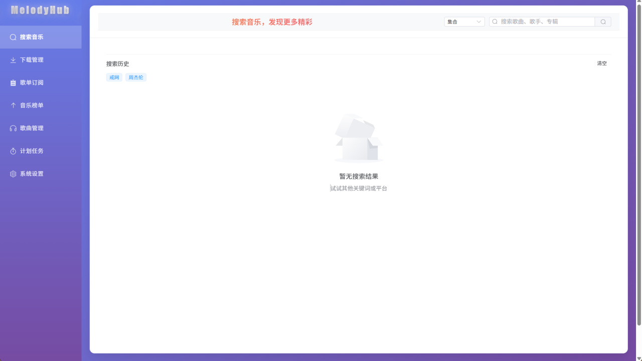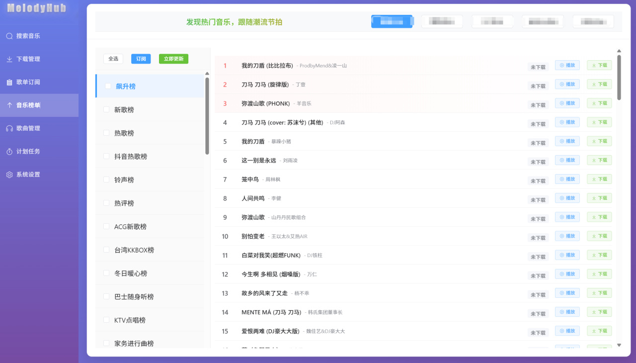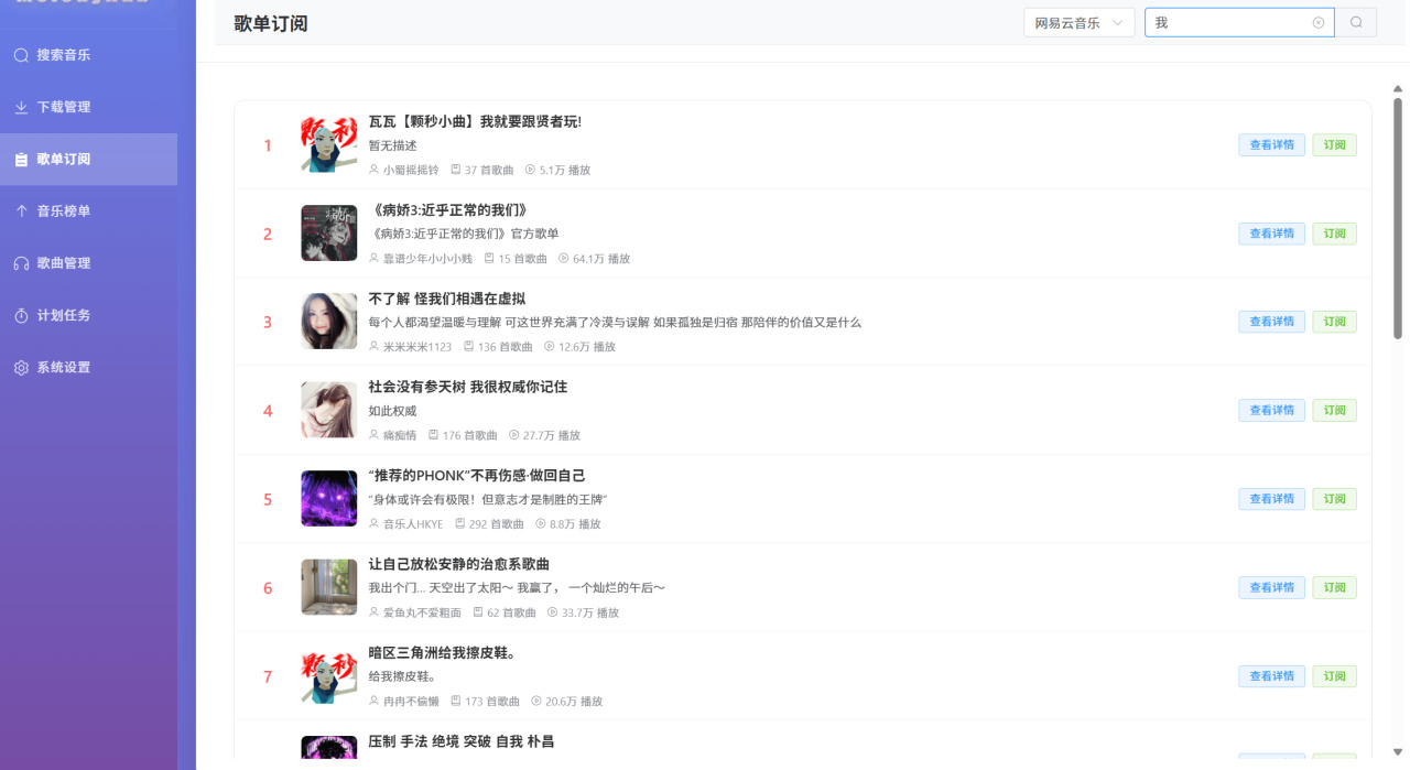 项目预览整体界面设计虽不花哨,但简洁明了,功能清晰。左边侧边栏能看到各个功能,支持搜索、下载、歌单订阅、榜单、管理以及计划任务和系统设置,右边则是操作区。