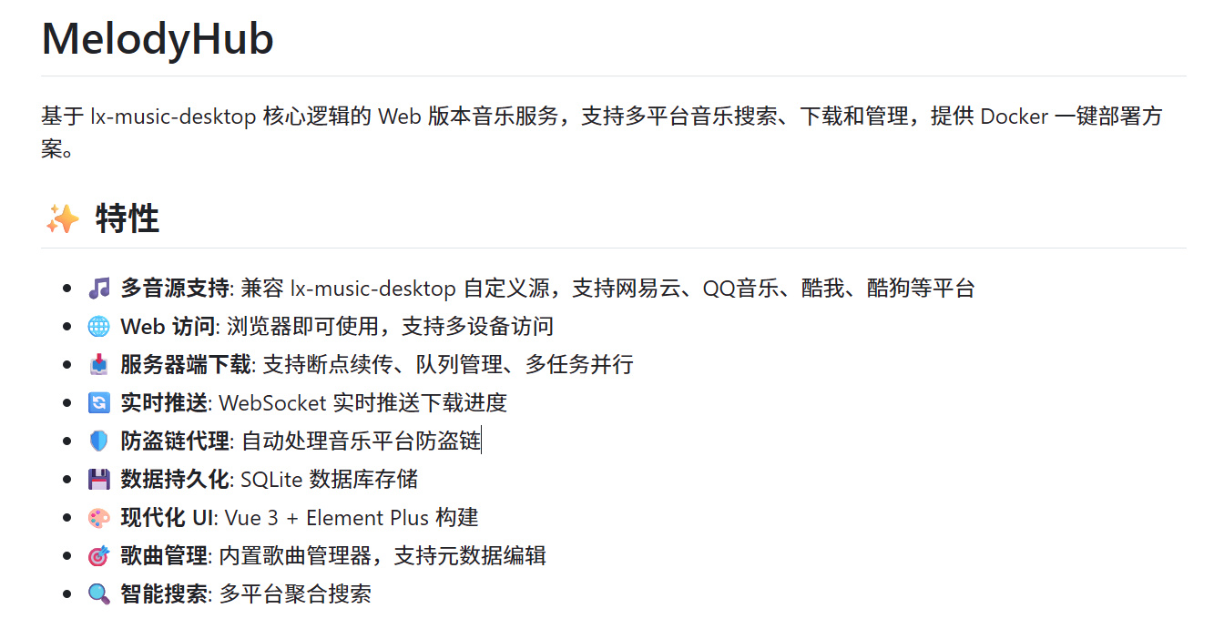 而 LX 作为开源项目,自然会有不少基于它的二次开发项目诞生。今天要介绍的就是基于 LX 的 Docker 定制版本——MelodyHub。它继承了 LX 原有的一切特性:自定义音源、多平台搜索、歌曲下载,除此之外,MelodyHub 还在原项目基础上 内置了歌曲管理器、元数据编辑 等实用功能。