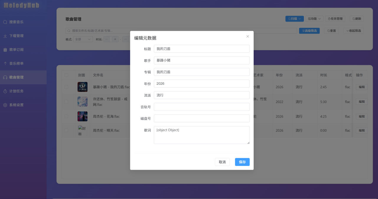 歌曲管理这里,项目内置了元数据搜索的功能,所以大部分歌曲都能直接搜索到封面、歌手、专辑等信息,搜不到的内容也支持手动进行编辑操作。