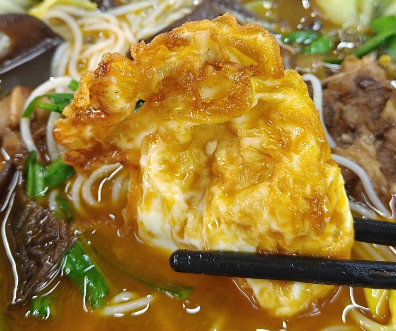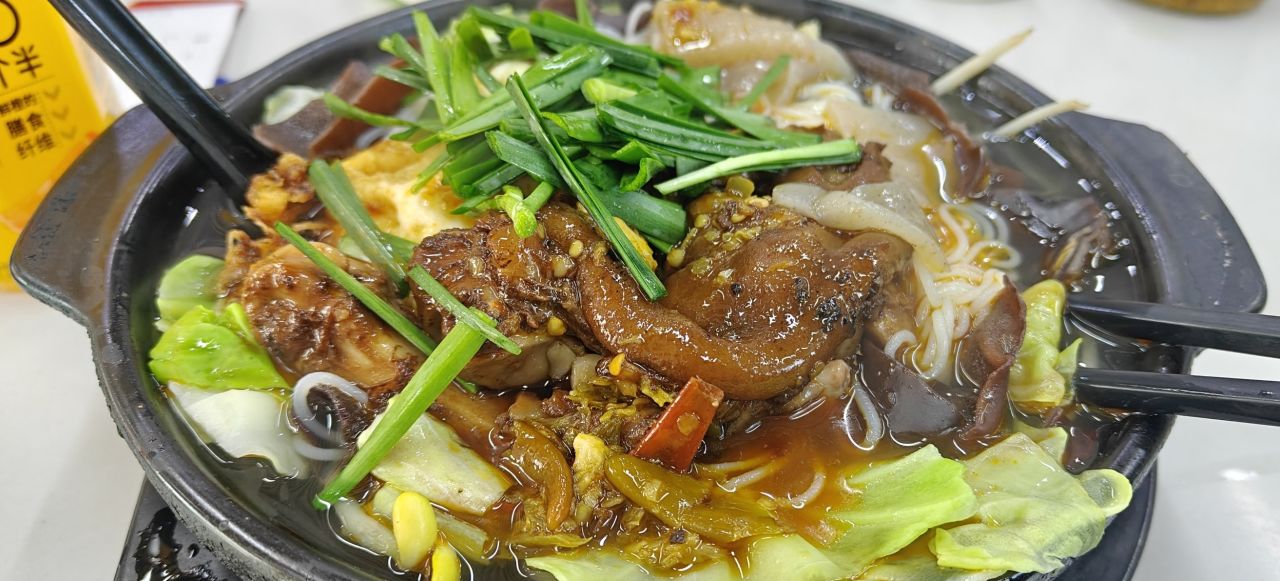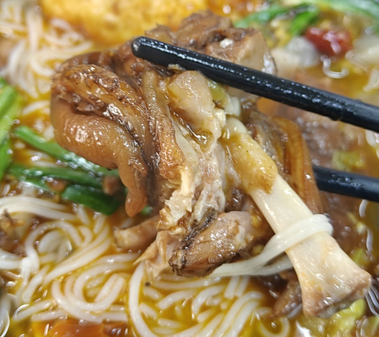 猪蹄有半片,是经过卤制的,炖得火候足够,软糯脱骨,入口一抿就来了。表皮发黑应该是拿火烧过,因此没有毛腥味,卤水的香料味也不重,泡在汤里能挂上泡椒的香辣。