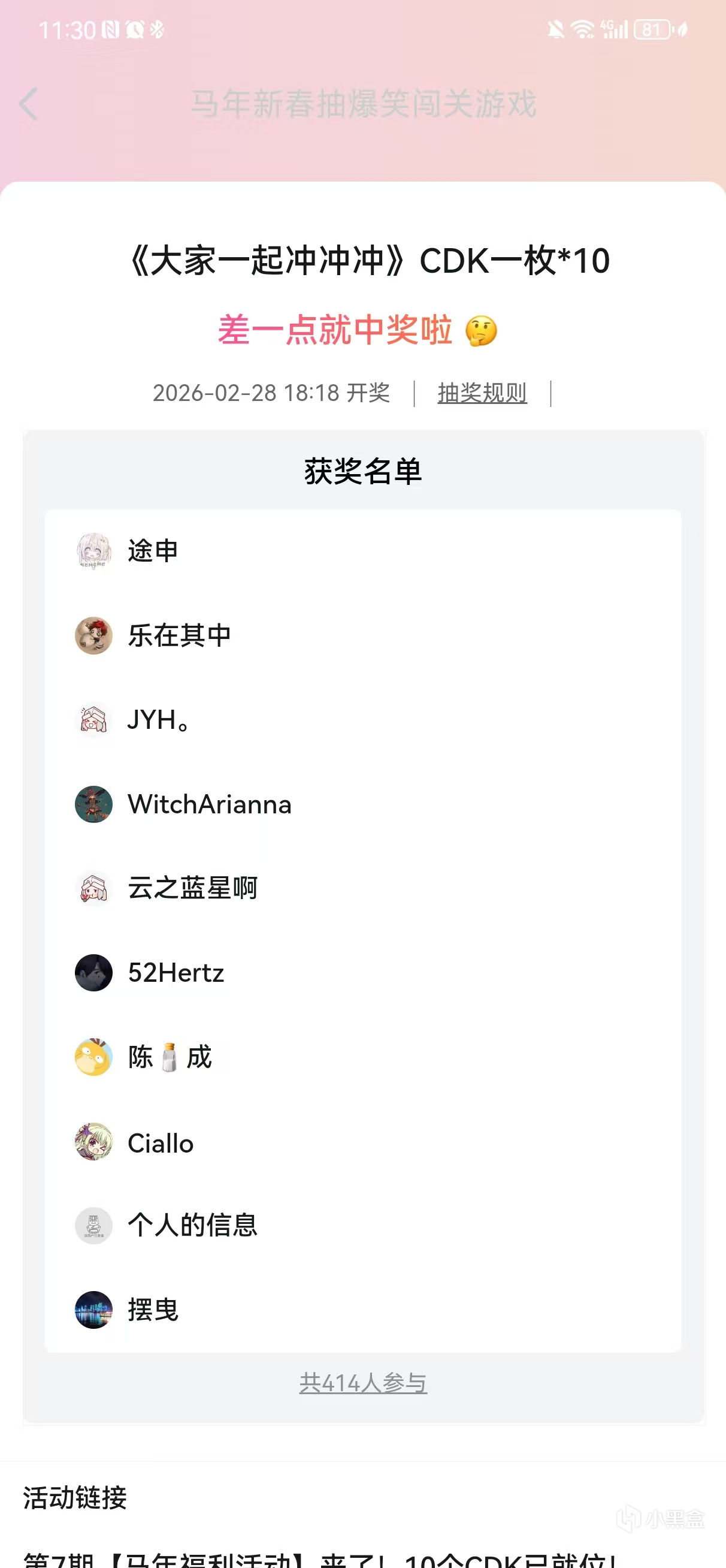 昨天下午18点18分咱们【第七期】抽奖活动顺利结束了,共有414名盒友参与,共抽出10名幸运盒友,中奖名单如下!感谢大家的支持,真的没想到会有这么多盒友参与进来,3月1日我们会开启第八期抽奖活动~大家可以关注一下,这样才能看到抽奖活动。。