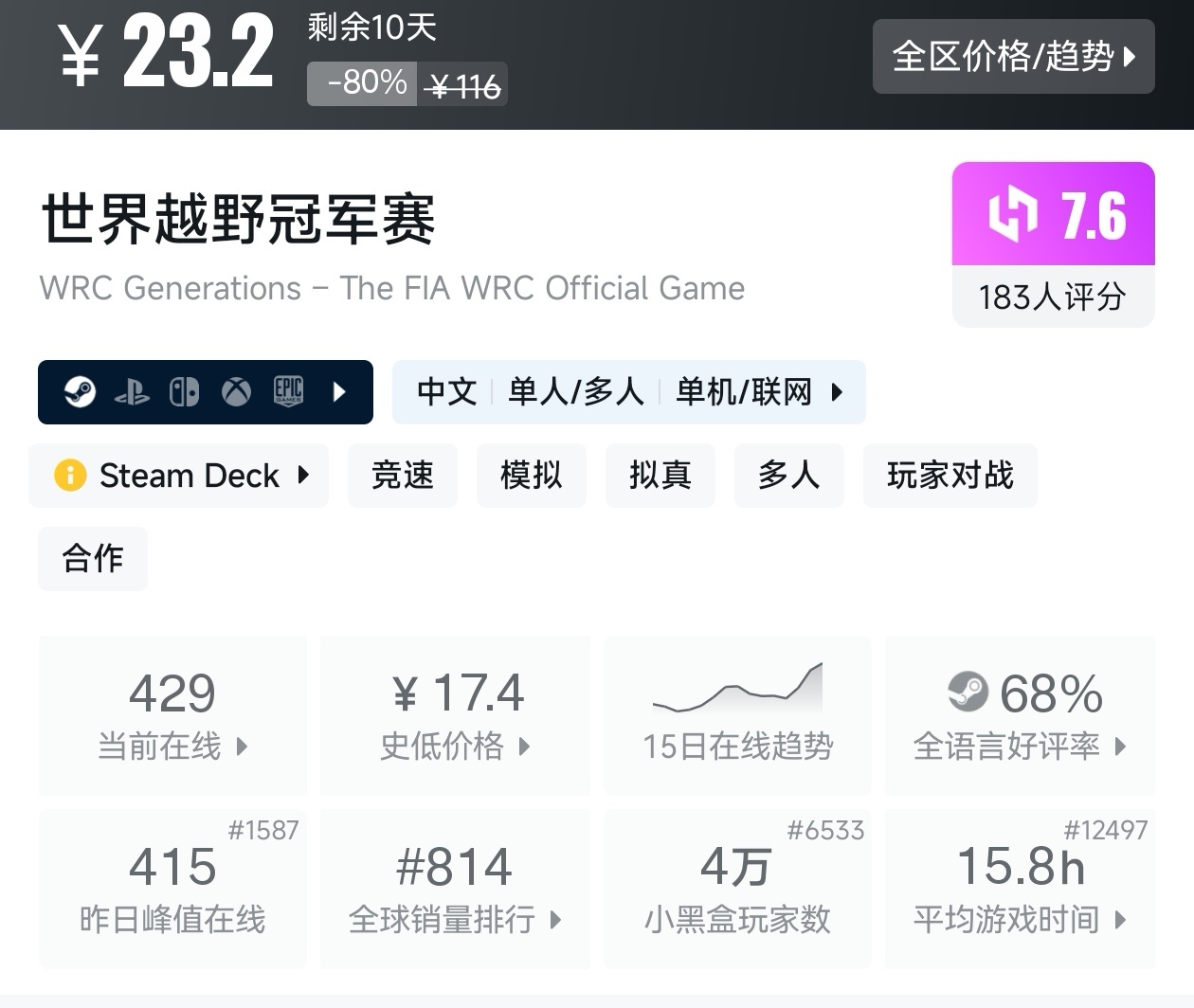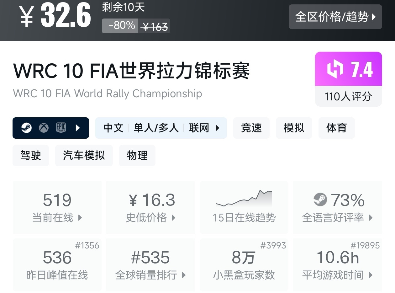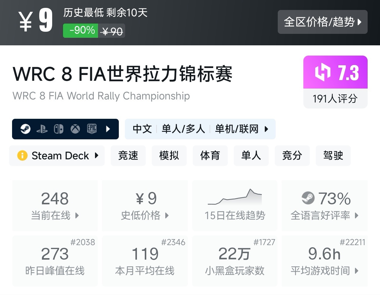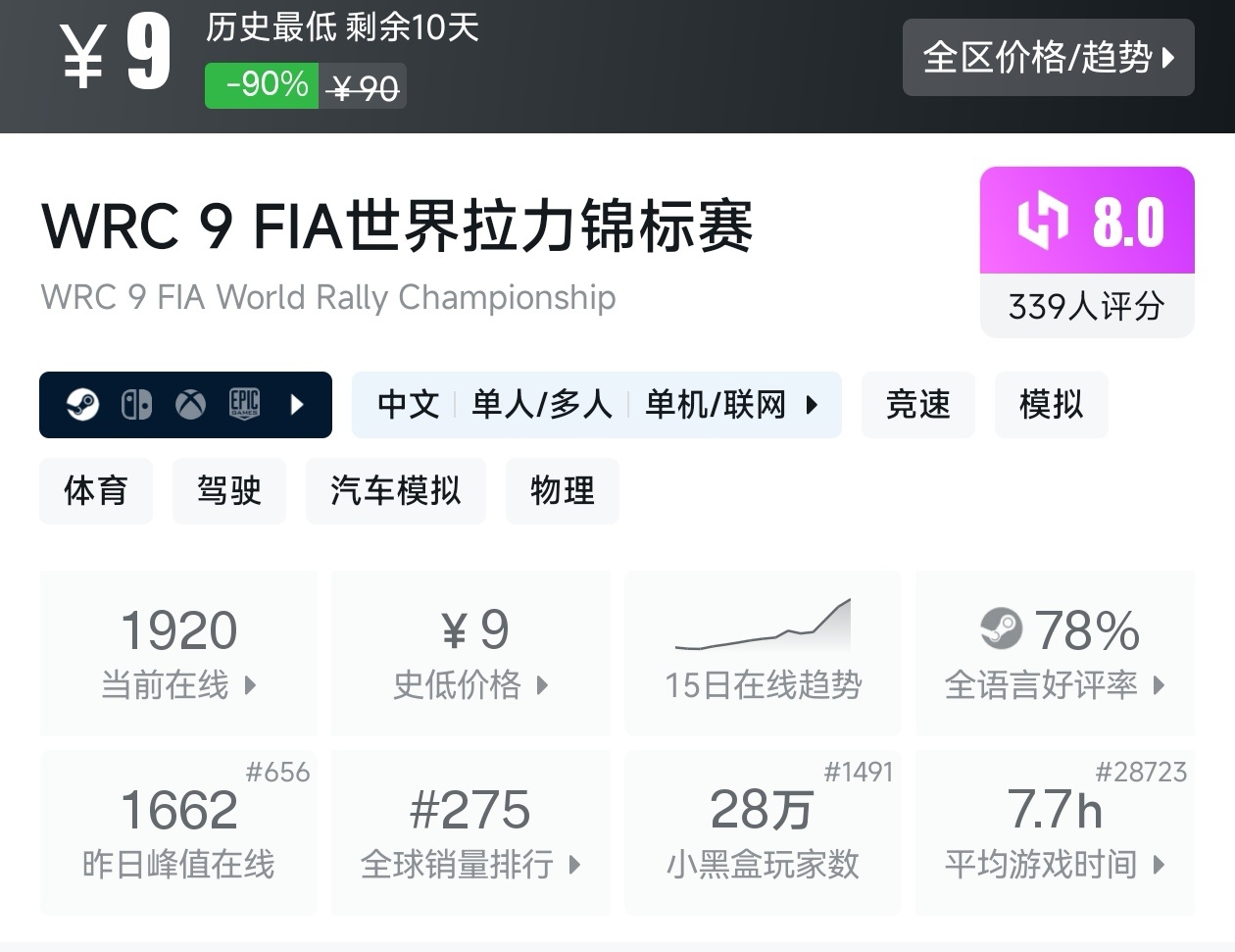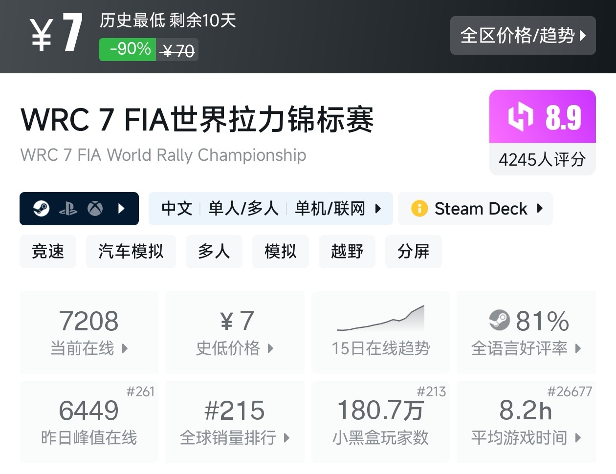 大家好,在最近,著名的拉力赛车游戏《WRC》系列都迎来了折扣,其中更是有几部都在史低,游戏折扣厉害挺大的,适合一些对拉力赛车感兴趣的盒友入坑,记得今年《WRC7》因为《飞驰人生3》火过一段时间,黑盒商城都被卖断货了,因为里面有中文路书,现在Steam有折扣,想买的盒友还不赶紧冲一手。