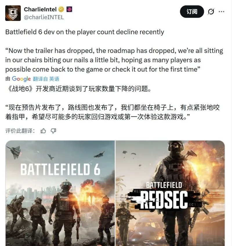 其次单机只要销量好看,后续的问题就是考虑下一部该如何赚销量了。但是长线运营的游戏要考虑日活这些问题,从《战地6》第二赛季官方的社交媒体发言就可以看出官方真的很在意人活数据,也说明《战地》系列运营理念开始转型。