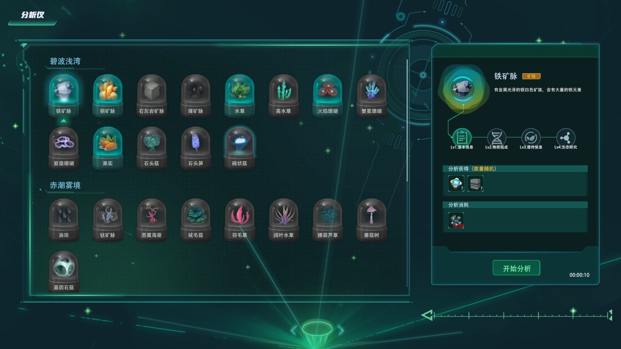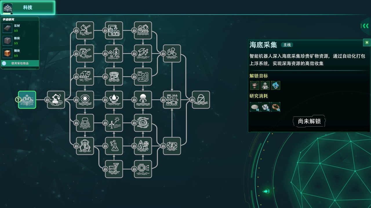 还有一个很明显的点:如果不加自动化,所有东西都要手动一个个合成,那游戏进度会被拖得极慢,科技树推进也会显得很假,深海工厂当中如果你手动采集,就需要反复点击矿物,而且还无法实现同步发展其他科技。