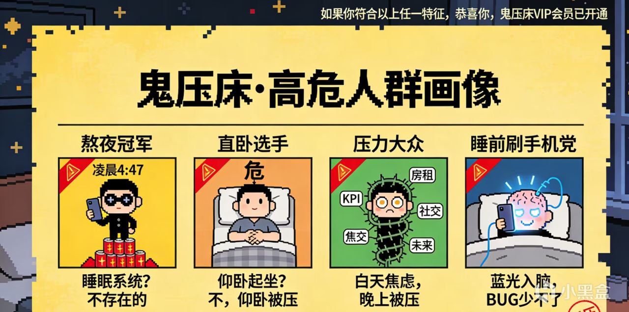 鬼压床比你想的更常见。大约每三个人里,就有一个人经历过。 但有些人更容易被“压”: 熬夜冠军 睡眠不足、作息紊乱,会让你的睡眠系统不稳定。卡BUG的概率直线上升。 仰卧选手 平躺着睡,更容易诱发睡眠瘫痪。侧卧会好很多。 压力大户 焦虑、压力大,会让睡眠变浅、觉醒次数增多,给BUG留下更多机会。 睡前刷手机党 蓝光刺激大脑,让你在清醒和睡眠之间反复横跳,增加系统紊乱的风险。 有睡眠问题的人 比如嗜睡症患者,鬼压床几乎是家常便饭。