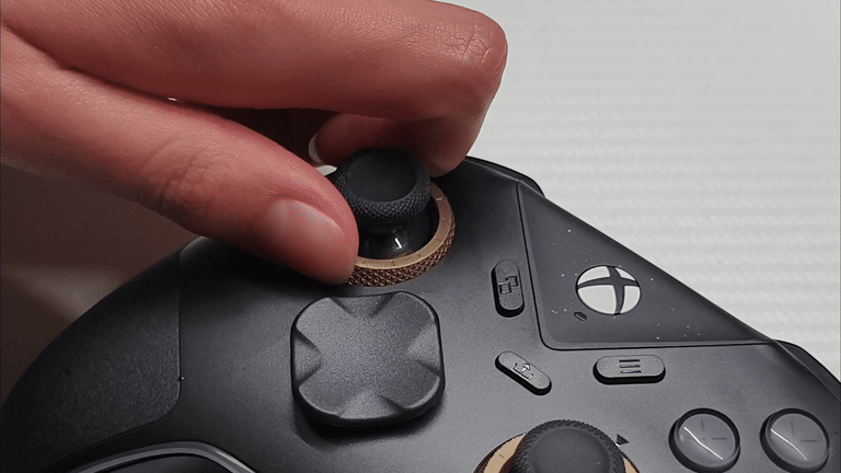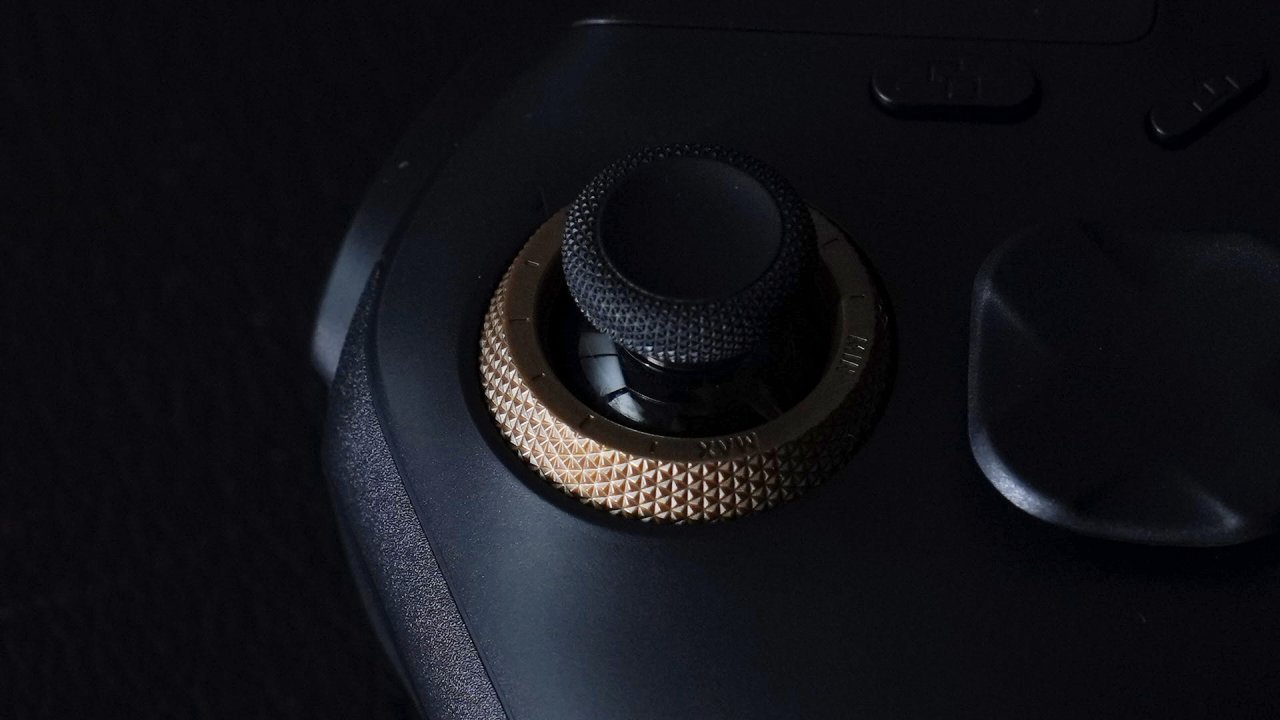 旋转它即可调节手柄的一个阻尼力度,可调范围为:40gf—100gf。这就导致如果你玩APEX这类游戏,你就可以把他的左摇杆调节为40gf,这样子我们操控人物可以让他走位更加灵活。然后把他的右摇杆调节为100gf,就可以让他对枪的时候不至于那么飘,定位也会更加精准一些。