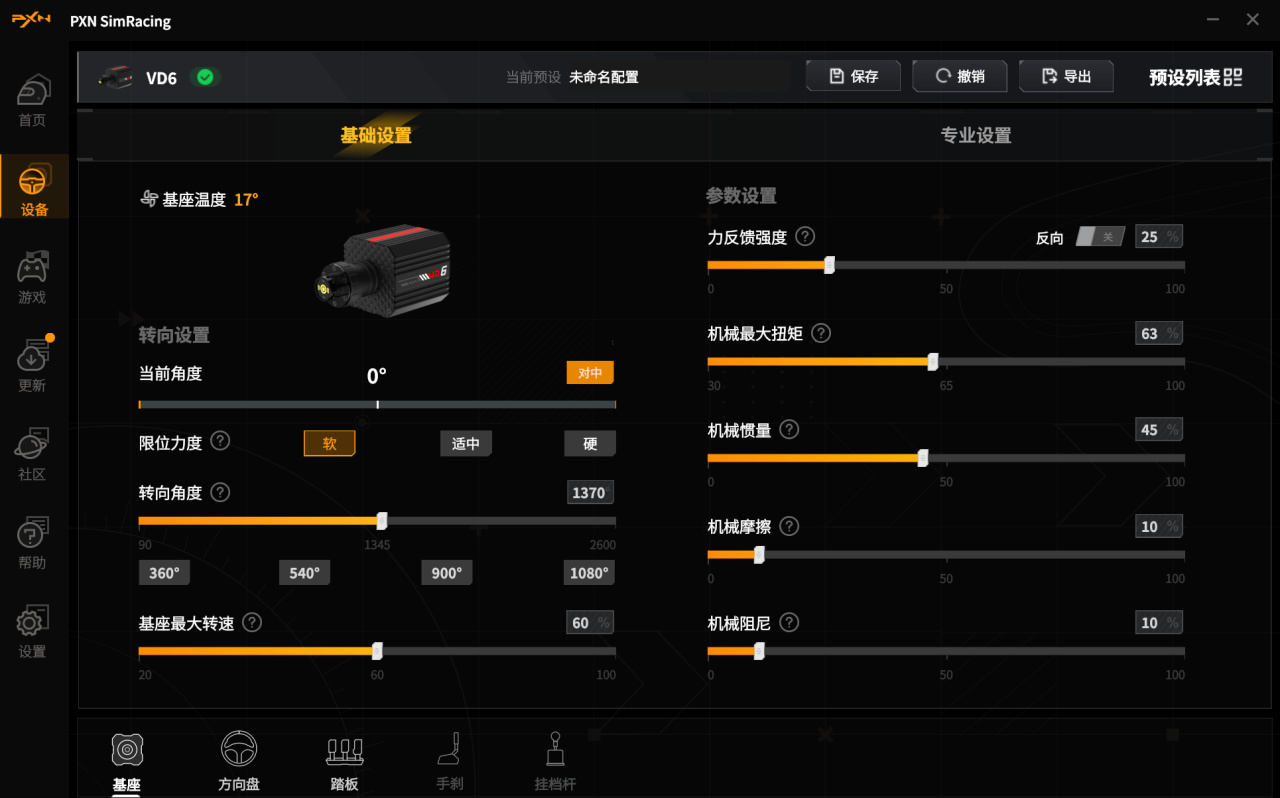 力反馈强度推荐在25%,只有这个力度,才能不那么费劲的操作,当然,100%也不错,就看你拿不拿的住,因为方向盘基座很稳定,你手被力反馈给震麻,都不会出现什么松动。