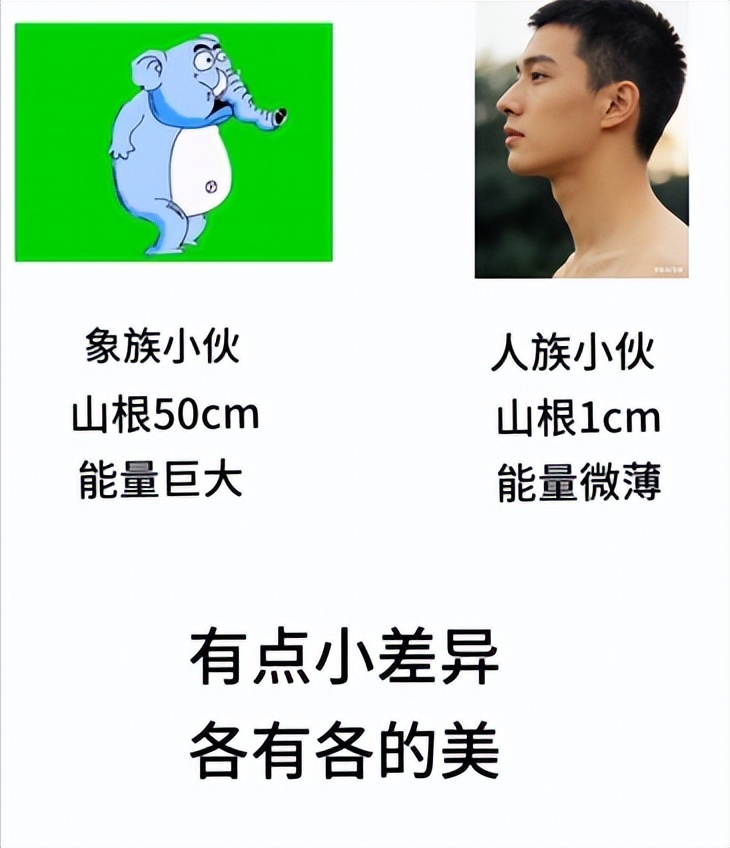 “有点小差异”指的是“废公”在用极端个例对比不同地区“山根”高度差异后,对“落败”的一方得了便宜还卖乖的安抚之语,意思是我们之间虽然“山根”高度有所差异,但是并不大(其实按图片来说很大)。