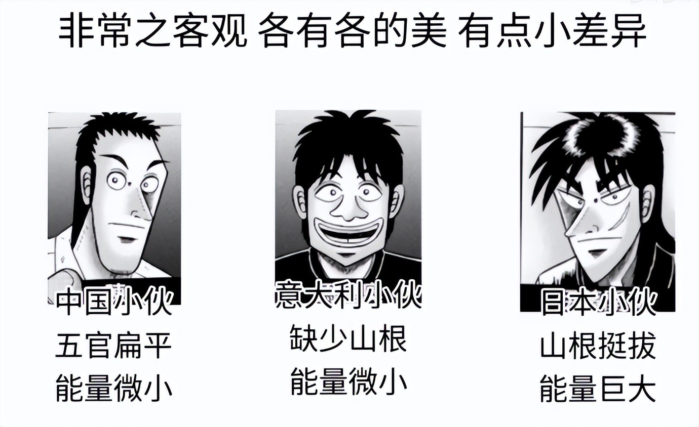 “各有各的美”与“有点小差异”差不多,是“废公”用北方明星长相对比南方普通人长相,并声称这是“胶东一般小伙对比其他地区最帅小伙”后给出的结论——虽然表面一碗水端平,但其实内里不乏讥讽之意。