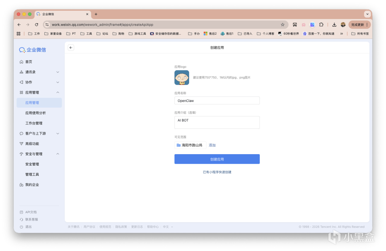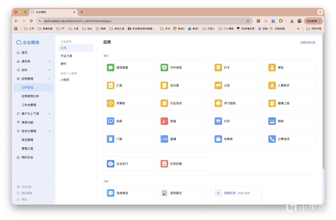 上面配置界面先别关闭。我们网页版登录企业微信,左侧栏「应用管理」,右下角点击「创建应用」。