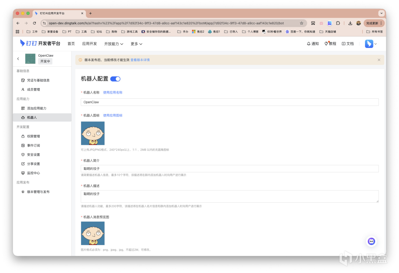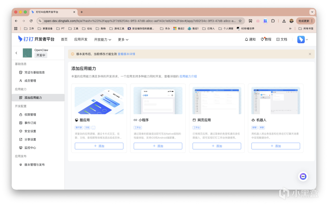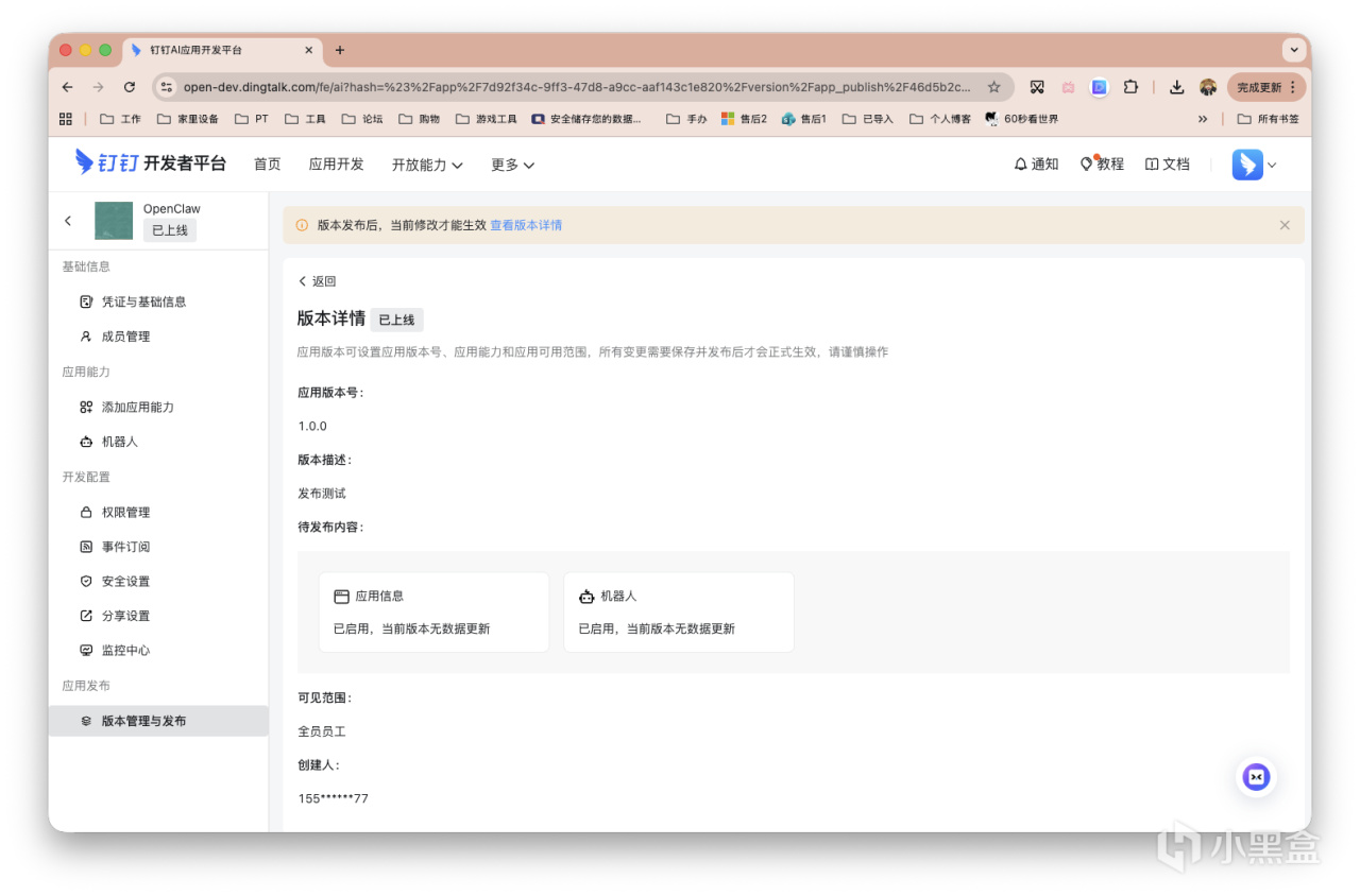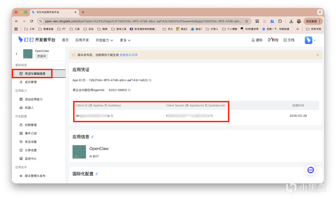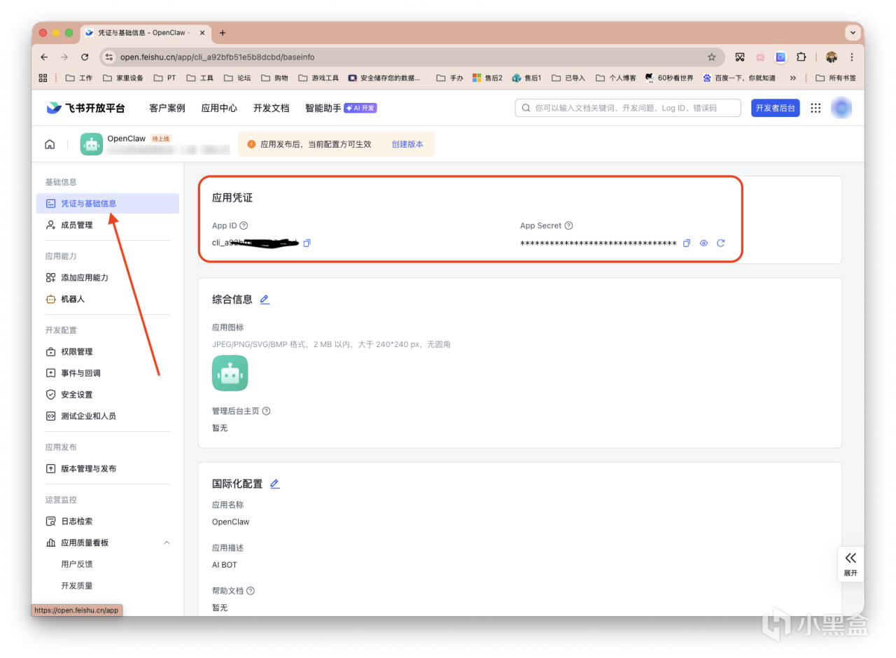 左侧栏的「凭证与基础信息」,获得ID和Secret。接着点击顶部黄色的警示框「查看版本详情」。
