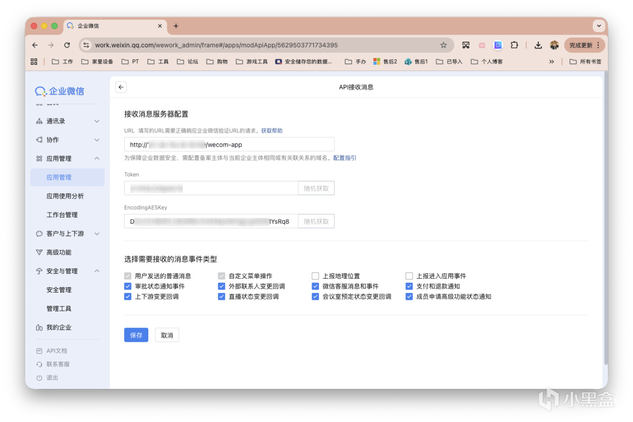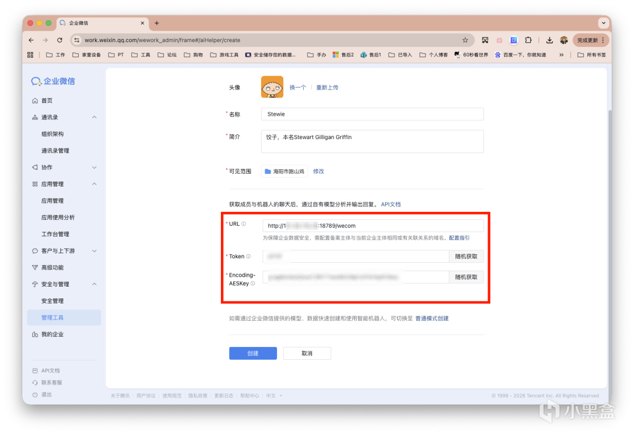 填写URL,http://<你的IP或域名>:18789/wecom,注意18789端口防火墙不要禁掉。其他两项随机生成。搞定后先放在一边别创建。