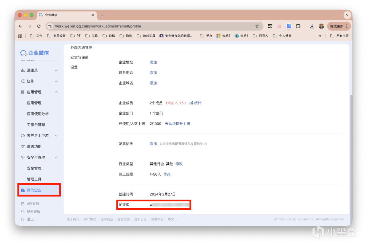 左侧栏最底下的「我的企业」,获取企业ID(corpId)。