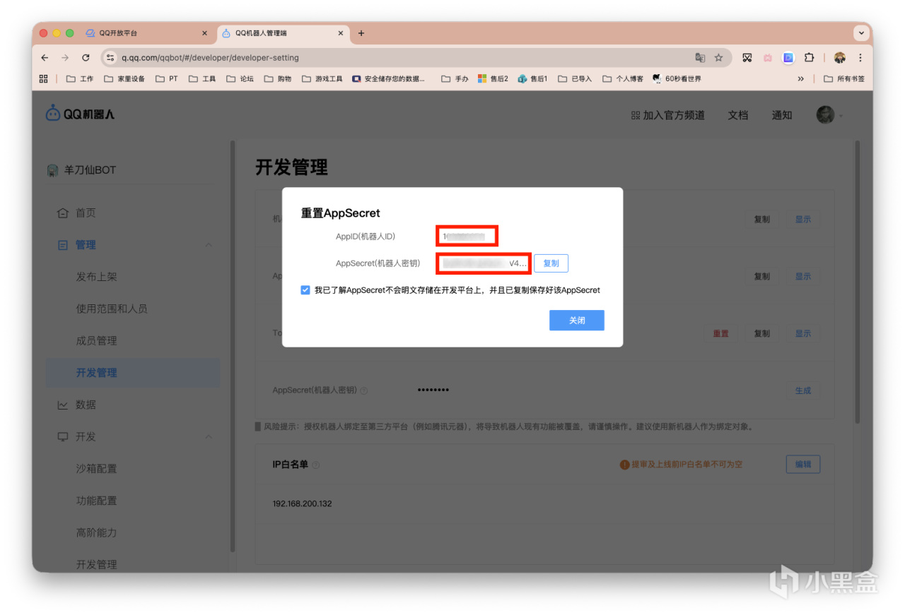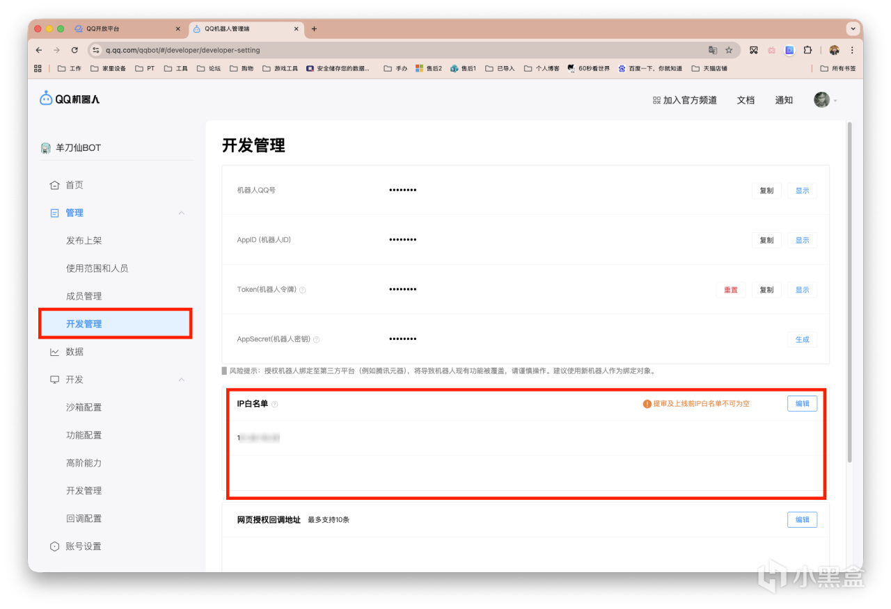 不过仍需要提前说明的是,在你的QQ_bot提审上线前,需要完成一系列配置和测试。尤其下图这个IP白名单,乃是最烦的一项,应当是需求提供公网IP。