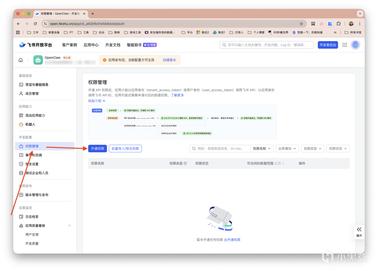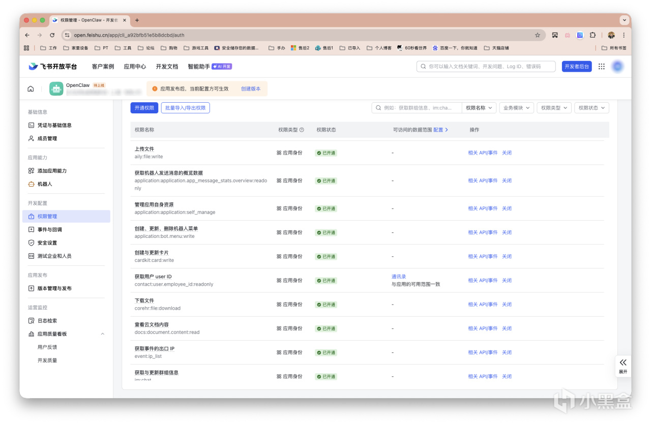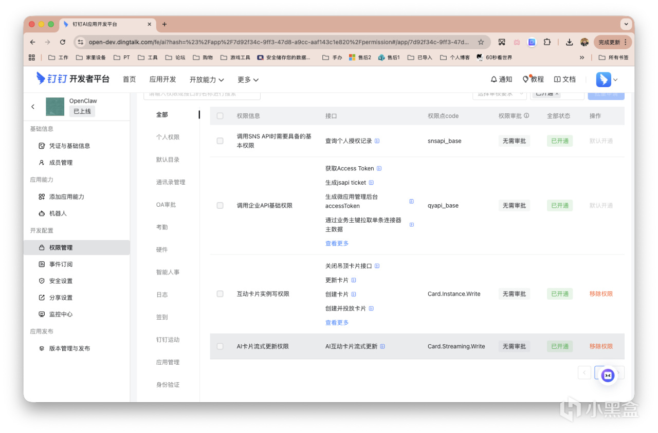 接着左侧栏,「权限管理」,搜索Card.Instance.Write、Card.Streaming.Write两项权限并开通权限。