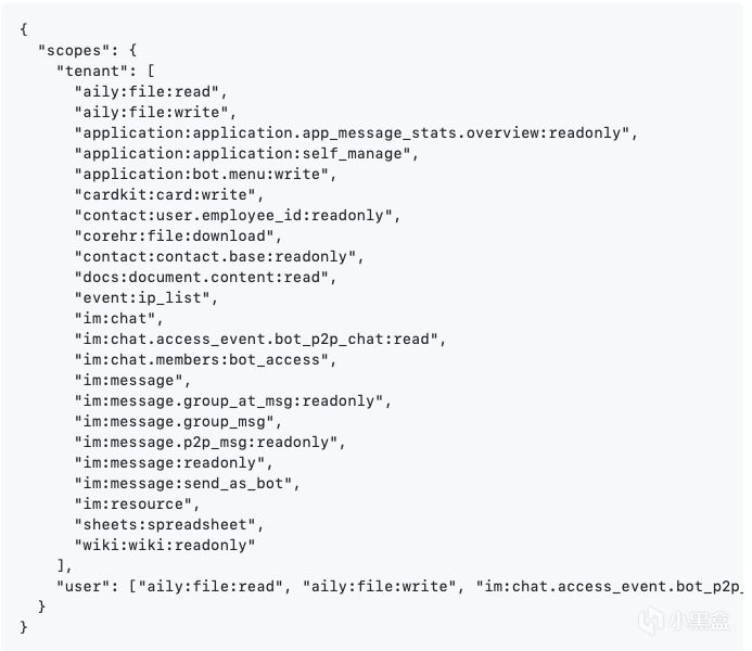 { "scopes": { "tenant": [ "aily:file:read", "aily:file:write", "application:application.app_message_stats.overview:readonly", "application:application:self_manage", "application:bot.menu:write", "cardkit:card:write", "contact:user.employee_id:readonly", "corehr:file:download", "contact:contact.base:readonly", "docs:document.content:read", "event:ip_list", "im:chat", "im:chat.access_event.bot_p2p_chat:read", "im:chat.members:bot_access", "im:message", "im:message.group_at_msg:readonly", "im:message.group_msg", "im:message.p2p_msg:readonly", "im:message:readonly", "im:message:send_as_bot", "im:resource", "sheets:spreadsheet", "wiki:wiki:readonly" ], "user": ["aily:file:read", "aily:file:write", "im:chat.access_event.bot_p2p_chat:read"] } }
