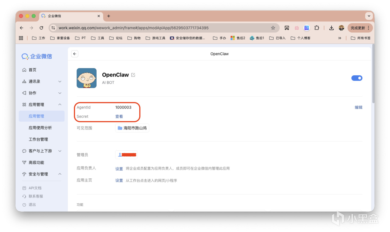 保存AgentId和Secret备用。