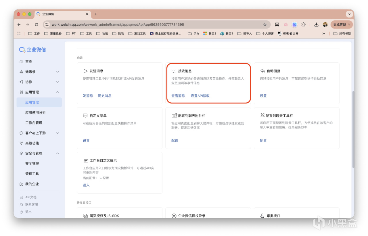 回到「应用管理」,在「接收消息」中点击「设置API接收」