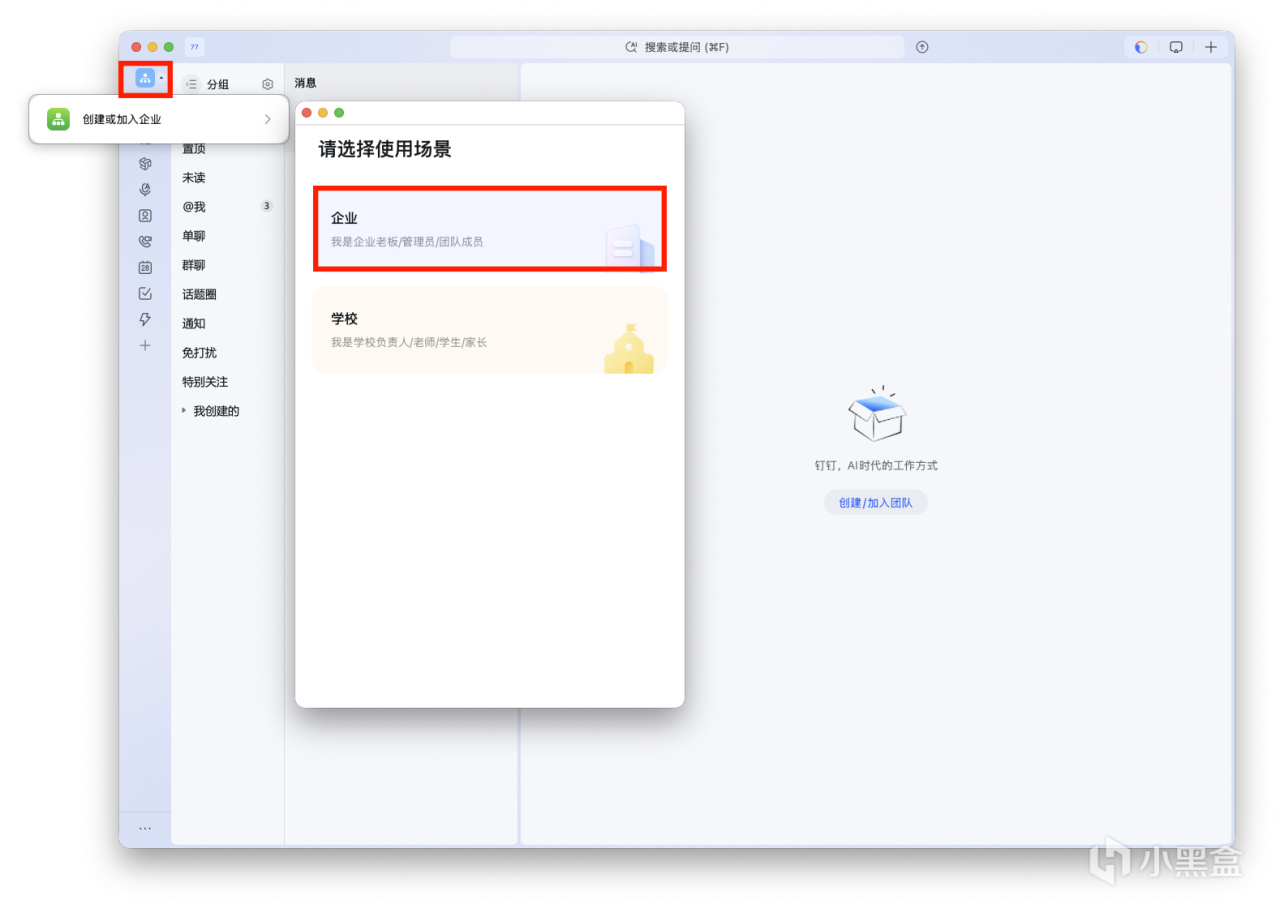 首先要去钉钉做准备工作。电脑端、手机端都行,创建或加入企业,我这里直接创建。