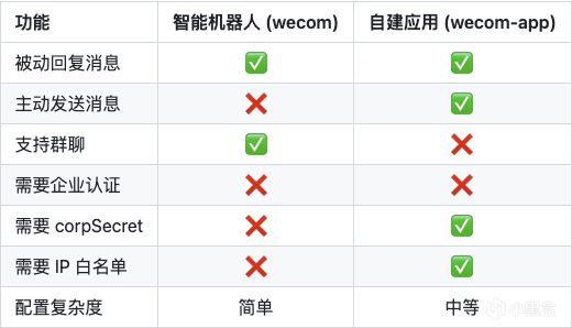 终于是到微信了~这里分为两种:自建应用,智能机器人(私聊场景)。区别在原项目截了个图供大家参考。
